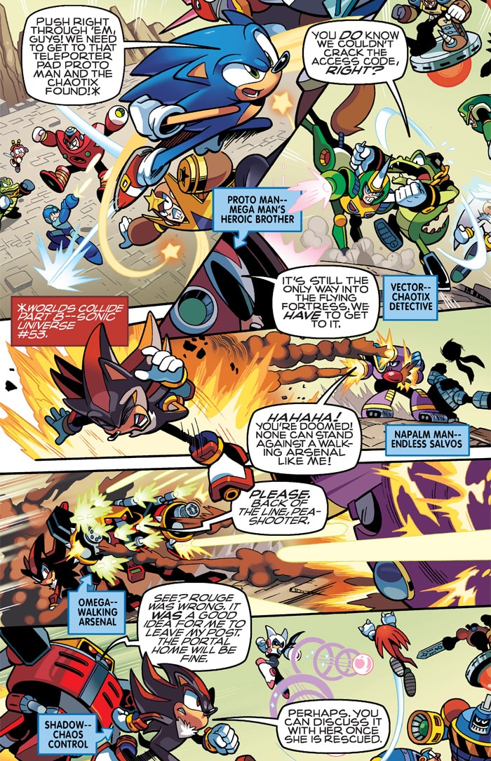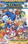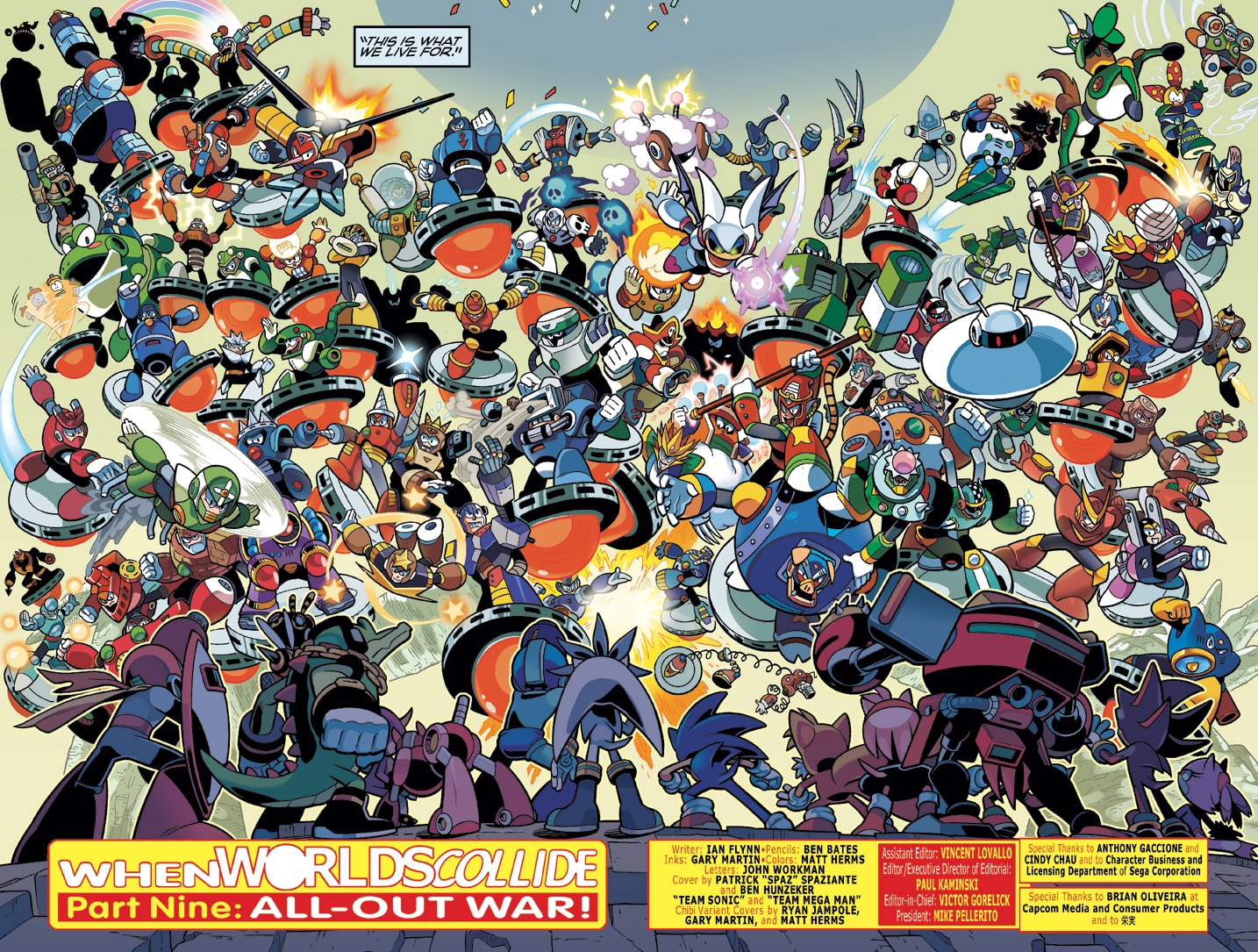 Celebrate 250 issues of the longest-running video game based comic series, Sonic the Hedgehog, with “When Worlds Collide” Part Nine of Twelve! The final act of the crossover mega-event starts here as Sonic and Mega Man stand united against the Wily Egg – and backing them up are all their heroic friends. Standing against them are the Robot Masters—all of them! Let the battle begin! At a whopping 48 pages, this double-sized issue features a special, digitally remastered re-presentation of the first Sonic the Hedgehog issue! Also featuring a stunning new wrap-around cover by Patrick “SPAZ” Spaziante. Plus, choose YOUR favorite hero with the “Team Sonic” and “Team Mega Man” CHIBI variant covers!