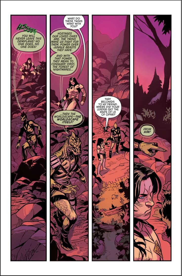 Red Sonja must escape a dungeon with a religious icon of Issus, Goddess of Death and Life Eternal, to use as a bargaining chip in the grim political war of the Worldscape! A battle against a vicious red dragon maroons John Carter and the Martian Tars Tarkas in a dangerous jungle filled with monsters and the greatest soldiers of three worlds! Tarzan clashes head-on with the original feral heroes of mythology: the demigods Romulus and Remus! The iconic antihero and half-elf Seltyiel finds himself in the gladiatorial Worldscape, facing off against two of Earth’s most sinister figures!