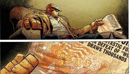 From his work on Jughead , Howard the Duck, and of course, Sex Criminals, Chip Zdarsky does funny very well, and that shows in Marvel Two-in-One with the Thing’s deadpan one-liners (Apparently, he was just the Fantastic Four’s “bus driver”.) and a hilarious meta-joke featuring all the actors who have played the Human Torch. But he mainly goes for pathos in this comic, which is helped by the range of expression in Jim Cheung’s pencils and the detailed added in by veteran inkers John Dell and Walden Wong. For example, there is a two page almost silent sequence where the Thing visits a warehouse with all the FF’s stuff, including the Fantasticar, and remembers his family and their last adventure in blue tinged flashbacks. The first half of the comic is almost overwhelming for him with reminders of Reed and Sue everywhere and call from beyond the grave for him to watch after Johnny, who is suffering from both grief and the possible loss of his powers.
