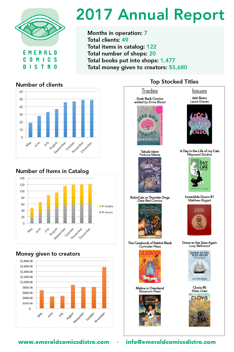 In 2017, Emerald Comics Distro served 49 creators and ended the year with 122 items in its catalog and worked with 20 shops in Seattle, Tacoma, Mill Creek, Shoreline, and Portland. You can find a map of all of the shops online.
