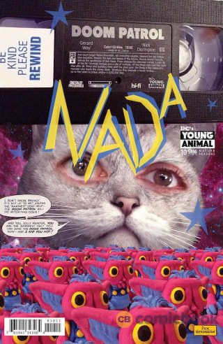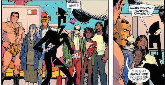 The overall narrative structure of Doom Patrol #10 is basically “$#*! continues to escalate until the entire comic book medium collapses in the end”, but Way buoys his script with hilarious and ass-kicking moments between the head scratching ones. Instead of being a metafictional comment on the different eras of superhero comics like in the 1996 Grant Morrison/Frank Quitely miniseries, Flex Mentallo continues to embrace his roots as a Charles Atlas parody and spout off facts about having a well-balanced diet and exercising at inopportune times. He is a fantastic source of comic relief, and the fact that his vast “Hero of the Beach” powers can’t save the day shows Mr. Nobody’s strength as a villain.