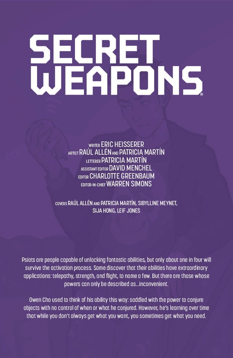 The complete SECRET WEAPONS creative team – Academy Award nominee Eric Heisserer (Arrival) and Harvey Award-nominated artists Raúl Allén and Patricia Martín (HARBINGER WARS 2) – reunites for an all-new, standalone tale spotlighting the Harbinger Foundation’s most unique talent of all!