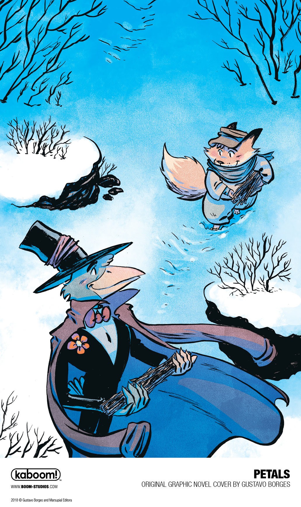 BOOM! Studios has announced Petals, an emotional new hardcover original graphic novel arriving in stores September 2018. Writer and artist Gustavo Borges, along with Eisner Award-nominated colorist Cris Peter, present a story set during a snowstorm in which a family of foxes desperately try to survive a merciless winter. One day, the young cub leaves his house looking for much needed firewood and crosses paths with a tall and peculiar bird wearing a singular top hat. This deeply emotional and resonant story about friendship, life and selflessness unfolds in a completely silent OGN.