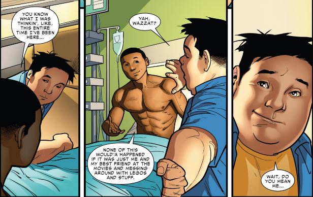 However, Spider-Man #240 isn’t all bad, and there is one series of scenes that made me smile. Brian Michael Bendis and Oscar Bazaldua spend a decent amount of time closing the curtain on the main constant in Bendis’ run writing Miles Morales: the friendship between Miles and Ganke. (There’s a reason that they’re the sole stars of the final Pichelli and Ponsor drawn page.) After weird medical testing talk, it’s refreshing to just listen to them talk about girls, video games, and how crazy their lives have been. After fighting supervillains and Latverians, Miles just wants to hang out and be a regular teenager. Bazaldua also includes a nice sight gag of Spider-Man (The Peter Parker one) lounging in a web hammock outside the hospital room in a great nod to Miles’ origin as taking on the dead Spider-Man’s legacy in the Ultimate Universe as well as Bendis’ 11 years of writing Peter in Ultimate Spider-Man.
