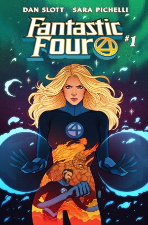 For her work on Fantastic Four #1, Sara Pichelli brings a looser, almost more playful art style that still shows emotions and body language in a fluid way with the help of inker Elisabetta D’Amico and colorist Marte Gracia. Even though he’s made of rocks, Pichelli’s take on The Thing is lively and utterly human. Beneath his ungainly movements, he’s a loving man, and the scene where he proposes to his long time girlfriend Alicia Masters is sentimental without being sappy. Dan Slott writes The Thing as maybe giving up on seeing Reed, Sue, Valeria, and Franklin ever again, but he still has a family in Alicia and Johnny. However, The Thing and the Human Torch aren’t always loving BFFs, and Gracia shows the subtle difference in the Torch’s flame when he’s going off in action and when he flies off the handle after Ben asks him to be his best man. This scene shows that there’s still tension in Ben and Johnny’s relationship in an organic, not drama for the sake of drama way and even builds off the way that Chip Zdarsky has written them in Marvel Two-in-One where Ben knows that Sue and Reed are lost forever while giving Johnny a false sense of hope that they’re somewhere in the multiverse.