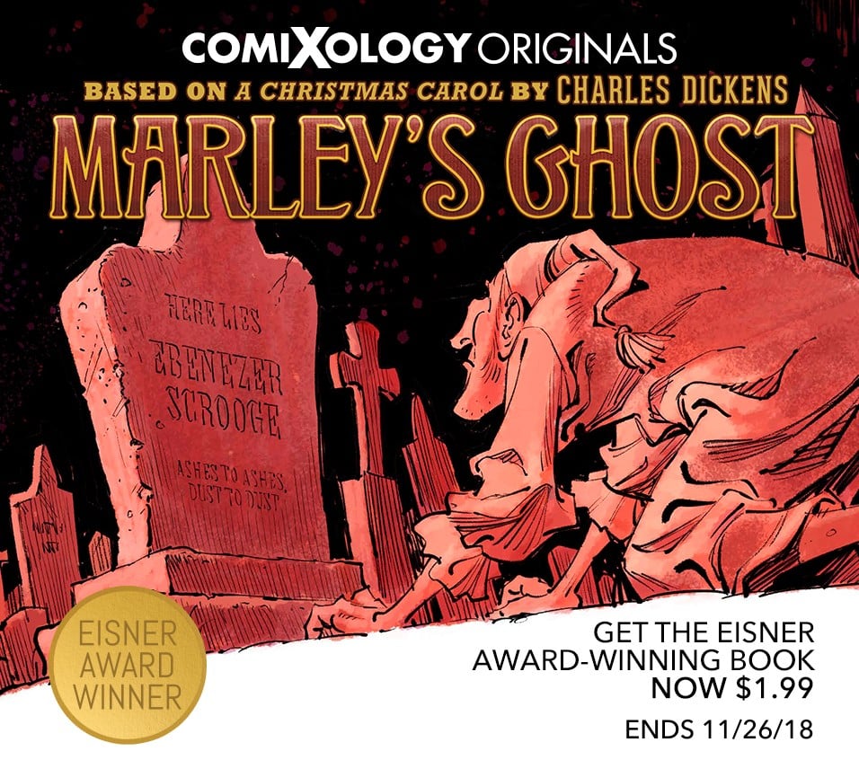 Halloween is over, Thanksgiving hasn’t happened yet, but the holiday season is already upon us! And in keeping with that ever earlier tradition, Eisner Award winning Harvey Kurtzman’s Marley’s Ghost, drops from $6.99 to $1.99 for a limited time on comiXology and Kindle. It’s a great time to read this gorgeously illustrated graphic novel adaptation of Charles Dickens’s beloved classic A Christmas Carol.