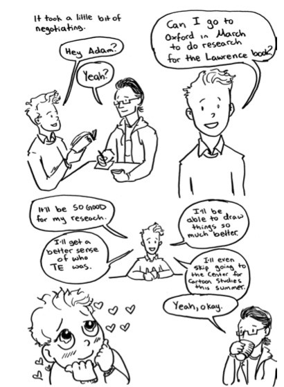 In the end, acknowledging Lawrence’s flaws doesn’t damper Barnett’s admiration. It just means she comes to a better understanding of him. The framing of the page above, I think, really illustrates that point. I get a sense of confidence from looking at the back of Barnett’s head. There are, in fact, many pages and images similar to this throughout Dreamers of the Day, allowing an intuitive sense of growth much better illustrated than if Barnett simply declared she had learned something.