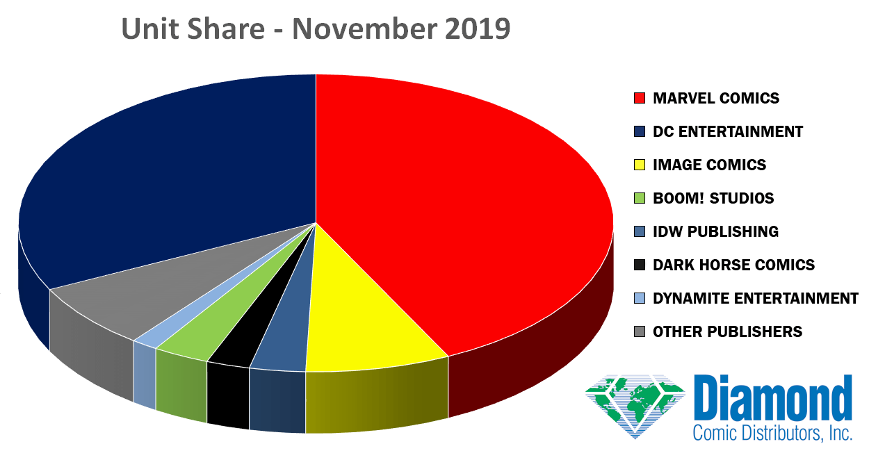 Marvel Comics was November’s top publisher, taking a 37.41% dollar market share (-2.10) and a 42.68% unit share (-2.52) DC was second, with a 30.72% dollar share (-0.95) and a 32.41% unit share (+0.39). Image Comics placed third with 7.90% in dollars (+0.31) and 7.87% in units (+0.69), followed by BOOM! Studios, IDW Publishing, Dark Horse Comics, and Dynamite Entertainment.