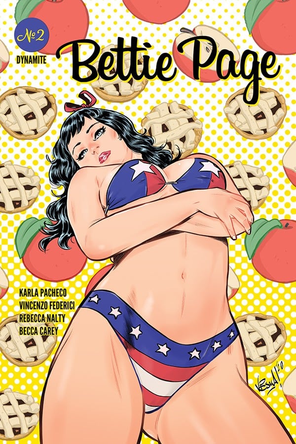 Joined by a fun background of apple pies, Bettie Page is herself an American icon of that caliber. Her work in pinup art and as a symbol of beauty and feminity has influenced countless artists within her home nation and around the world. Italian Vincenzo Federici, interior artist for the title, pencils, inks, and colors this fun and flirty cover for the second issue of Karla Pacheco‘s upcoming yarn.