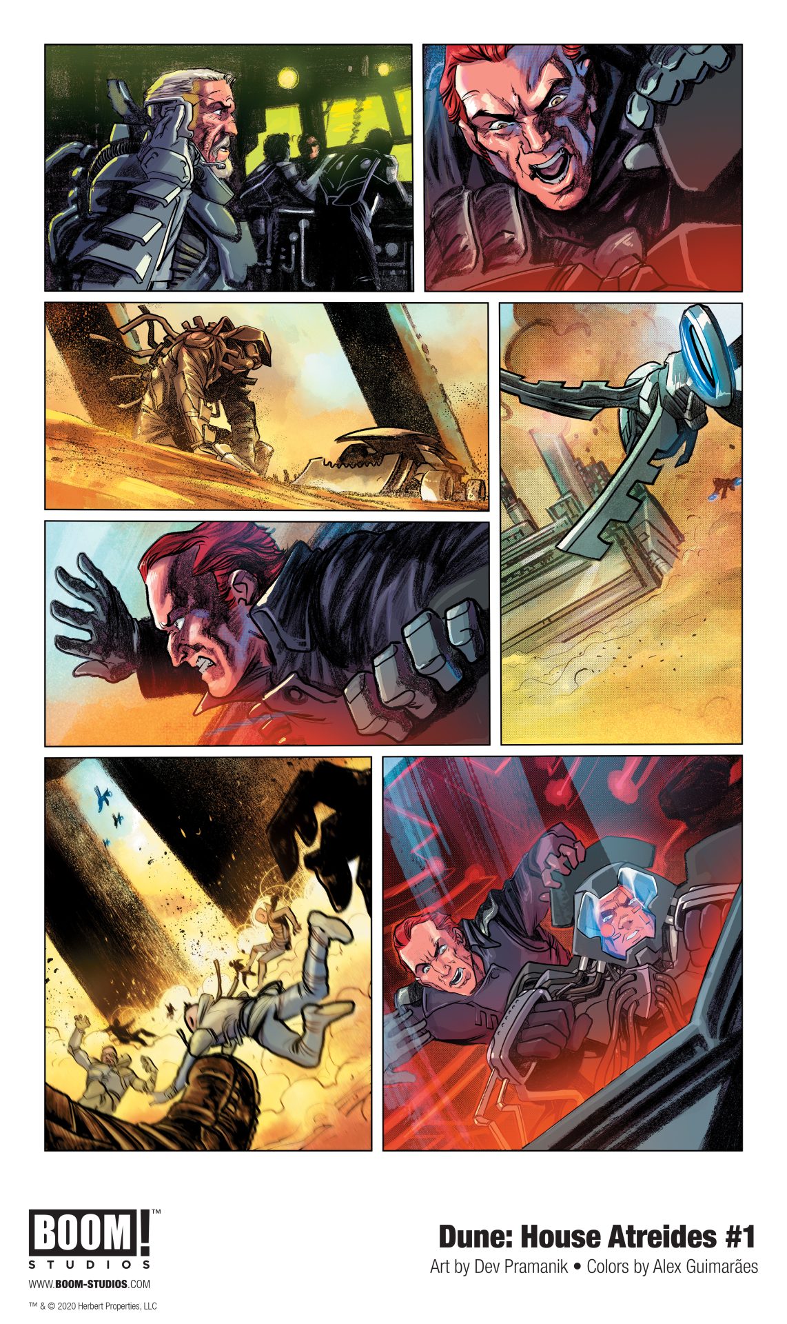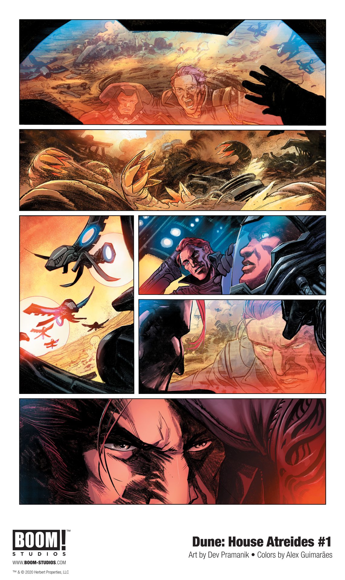 BOOM! Studios has released a first look at Dune: House Atreides #1, the premiere of a twelve-issue comic book series arriving in stores on October 21, 2020. This will be adapted and scripted by Brian Herbert and Kevin J. Anderson, who co-wrote the eponymous prequel novel based on Frank Herbert’s notes and illustrated by artist Dev Pramanik and colorist Alex Guimarães, in partnership with Herbert Properties LLC and in full coordination with Abrams ComicArts, who are publishing in the fall the first of three graphic novel adaptations of Herbert’s original classic novel Dune.