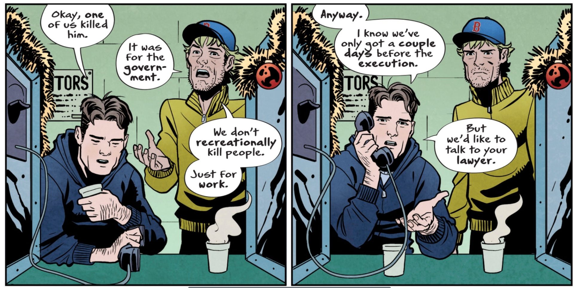 The environments the story takes place across are so believable. From a Waffle House to a working class Boston home to a Virginia mansion built on the bodies of the dead, the detail shines through. Not just in the background of the panels but in the voices in the background of the panels.