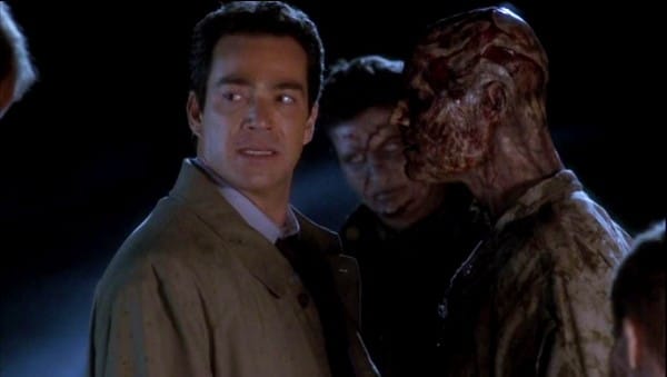 This dialogue exchange happens early in Homecoming (dir. Joe Dante), a strange but unique zombie story from the Masters of Horror anthology series created by director Mick Garris (The Stand). It serves as a preamble for what’ll come soon after the two conversations between the two characters ends, which flips the zombie formula on its head with bravado. An army of undead war veterans rallies from beyond the grave for one final mission: to vote against the president that sent them to war based on a lie. A lie that killed them.
