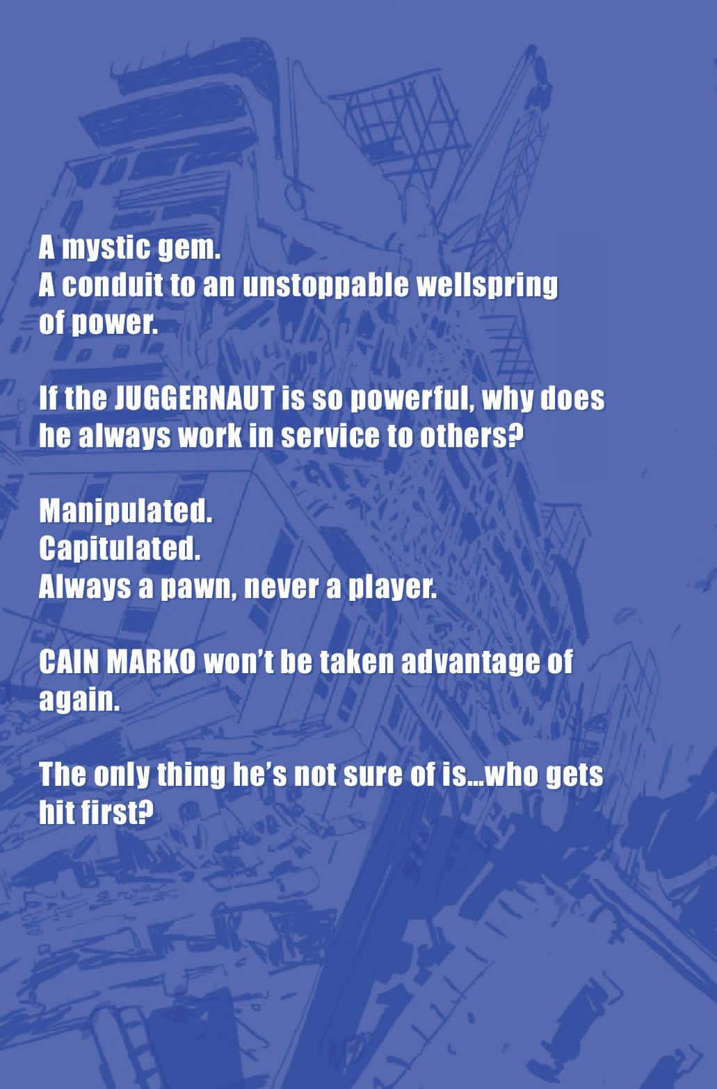For once, Juggernaut is worried about something other than himself. It’s not easy, it’s not what he’s used to… but D-Cell is counting on him. Try and stop him from helping.