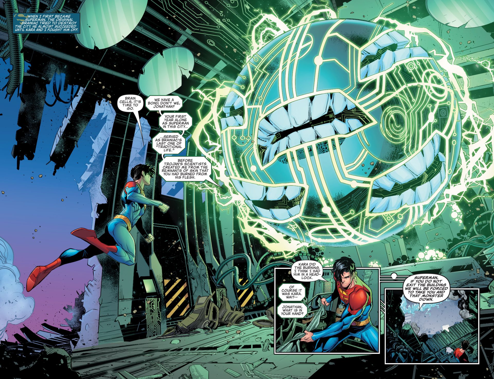 Before leaving for parts unknown, Clark Kent entrusted Earth’s safety to his son. Now, Jonathan Kent is Superman! Top priority for this new Superman: to protect Metropolis. When a new version of Brainiac attacks, Jon takes drastic measures-which result in the Bottle City of Metropolis! But watch out, Jon, because Supergirl is on her way, and she is not happy with your decision. Meanwhile, in the new bottle city, a new hero has risen. Jake Jordan, the former Manhattan Guardian, came to the City of Tomorrow to start over. But he’s not the only one who wants a new beginning. An anarchist calling herself Honest Mary sees this time of trouble as an opportunity for rebirth-and she’ll tear down the entire city to prove her point. Does Jake have what it takes to save his new home from disasters both inside and out of the bottle? Superman’s former pal Jimmy Olsen is going to make sure he does! Finally, the current Mister Miracle, Shilo Norman, is also in the bottle, and he’s looking for a way out! He’d better be careful, though, or he may end up someplace unexpected. It’s a story that continues in Superman: Worlds of War #1!