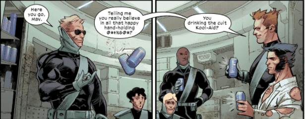 Wolverine #10 features quite a few of these compositions from Kubert, namely, a double page spread freezing a moment in time while the story progresses through small grids or inset panels. This is also happening while Martin sets the general tone of the page with his color choices from sleazy neons for the port of Madripoor to *fittingly* black for the Mercs and finally light greens for Krakoa. Frank Martin uses darker greens for the inset panels to drive home that Maverick is really hostile and skeptical about Krakoa even if it means rest and the restoration of his considerable abilities. These color choices along with the insets give you the key story information about the sequence while the rest of the spread adds context and atmosphere. They also show how Maverick is still boxed into his past as a merc and is cool with taking money from the CIA (Who tried to kill him earlier) even while he chides and quips at Wolverine for being a cult leader and Kool-Aid drinker. He’s definitely the kind of guy who says “sell-out” unironically.