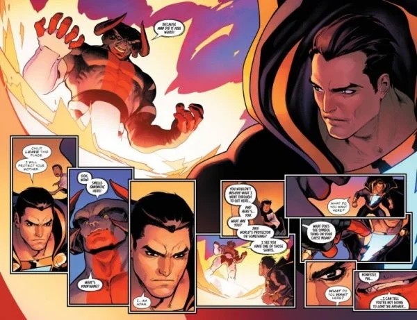 However, as well as setting up a big-time enemy for this disassembled team to face, Ram V and Xermanico still find time to explore the relationship between John Constantine and Zatanna. There’s a real softness to their interactions even as Constantine does his usual con man hijinks to get them out of a bind as the narration goes slightly nihilistic and focuses on humanity’s stupidity and willingness to place their lives in religions and cults while there’s literally bigger fish to fry. I love how Constantine cares about Zatanna’s feelings after the loss of her father and the disbandment of Justice League Dark, and Xermanico shows this through a beat panel where their hands nearly touch. Constantine and Zatanna will never be a stable couple, but V and Xermanico know they have great chemistry and use it to carry this initial installment of “Justice League Dark” because while Merlin is quite metal, we need someone to root for.