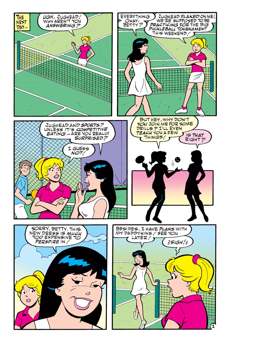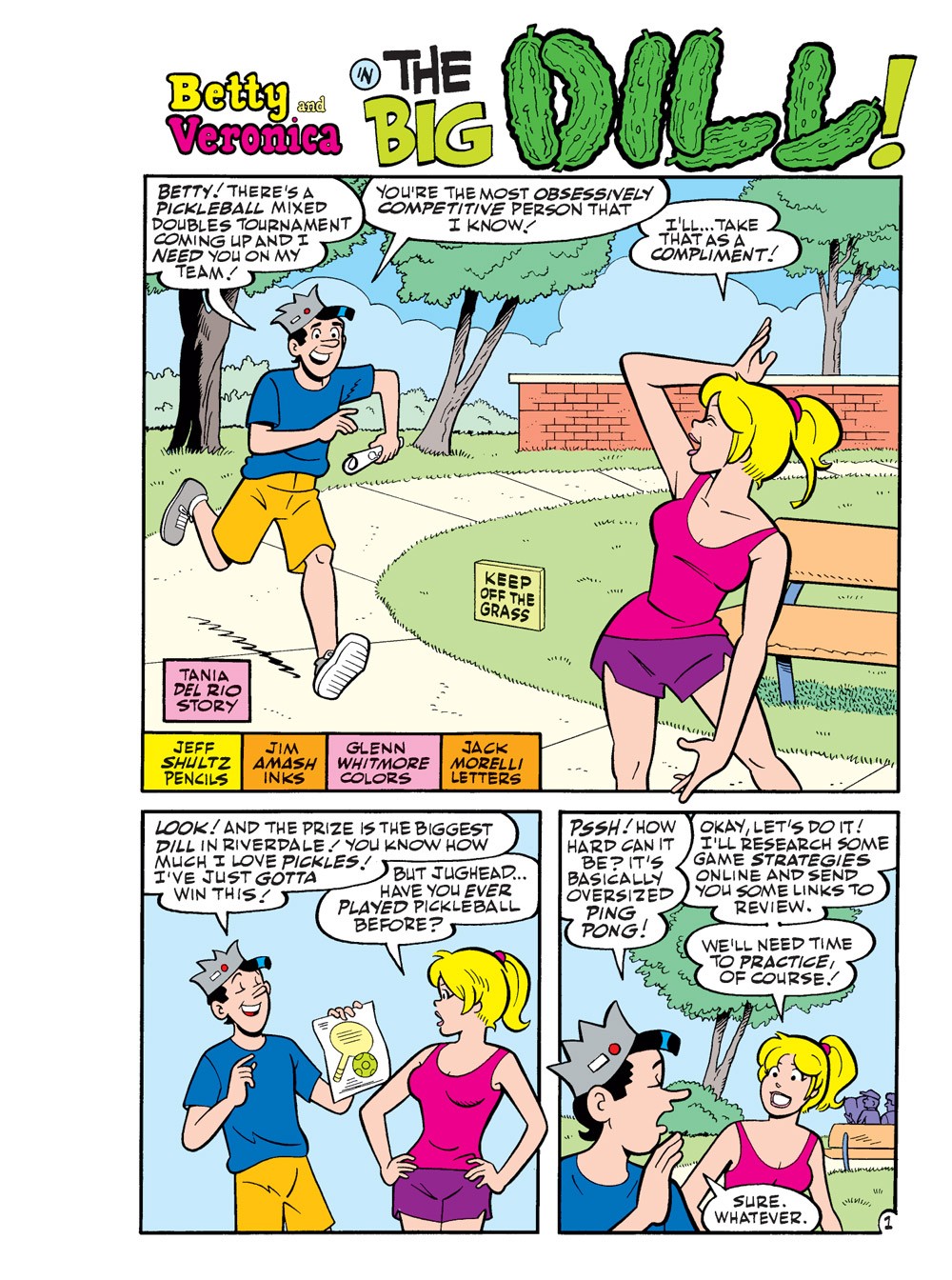 NEW CLASSIC-STYLE STORY: “THE BIG DILL!” Jughead asks Betty for a favor. He’s heard about a sport called “Pickleball” which is a cross between tennis and ping pong, and he wants her help in an upcoming tournament, in which the main prize is a “Big Dill.” Jughead loves pickles and wants to win! Betty, who loves any chance to play a new sport, agrees—but will they have what it takes to face-off against the Pickleball masters, Veronica and Hiram Lodge?!