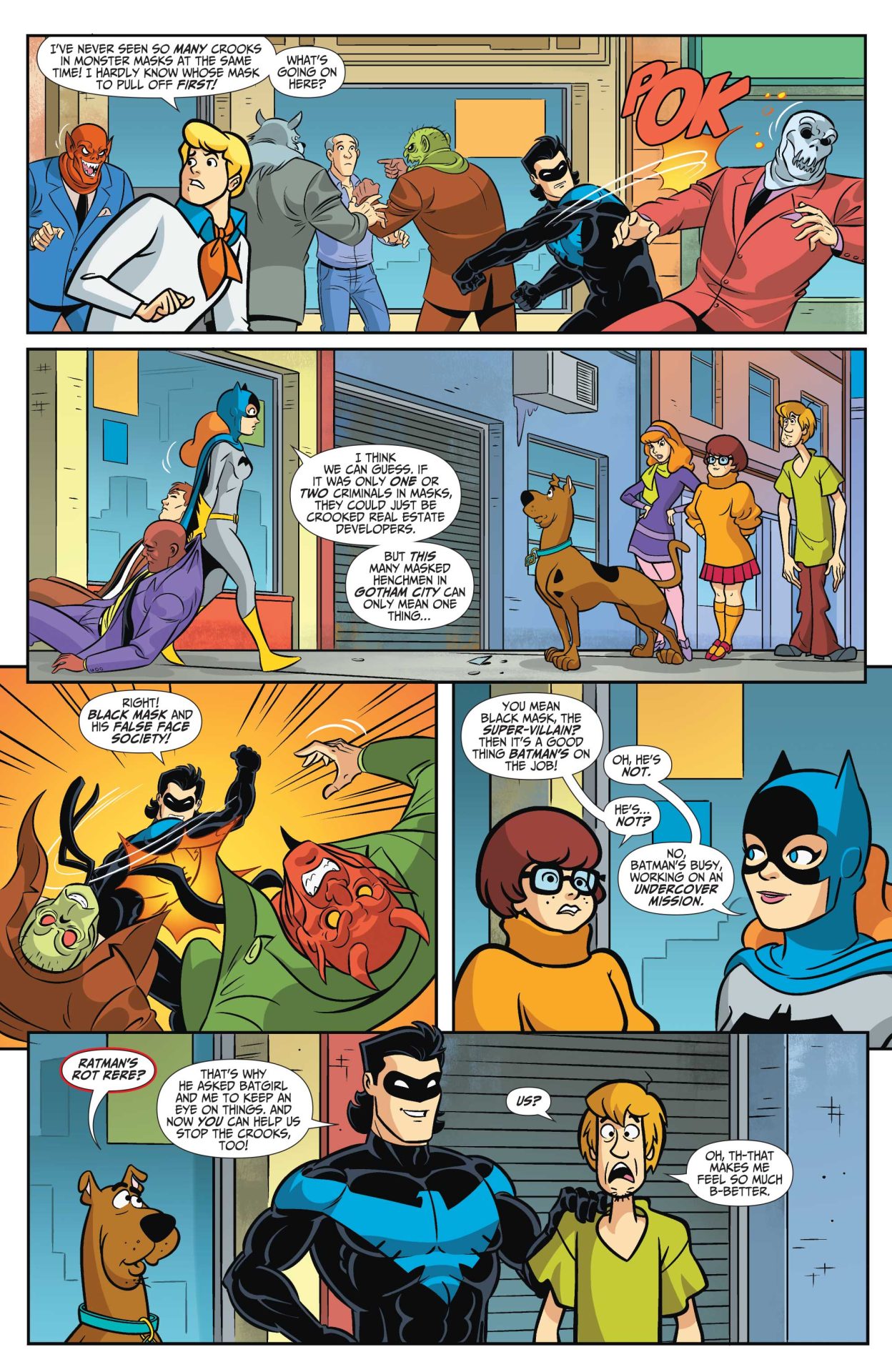 One or two monster masks might just mean there’s a smuggler or crooked real estate developer in town. But when Gotham City is terrorized by an army of thugs in monster masks, it can only mean one thing: a citywide crime spree by Black Mask and his gang, the False Face Society! With Batman mysteriously missing, and Nightwing and Batgirl up against a horde of crooked creatures, it’s lucky that the heroes have help from Scooby and the gang. After all, who has more experience in pulling the masks off bad guys?