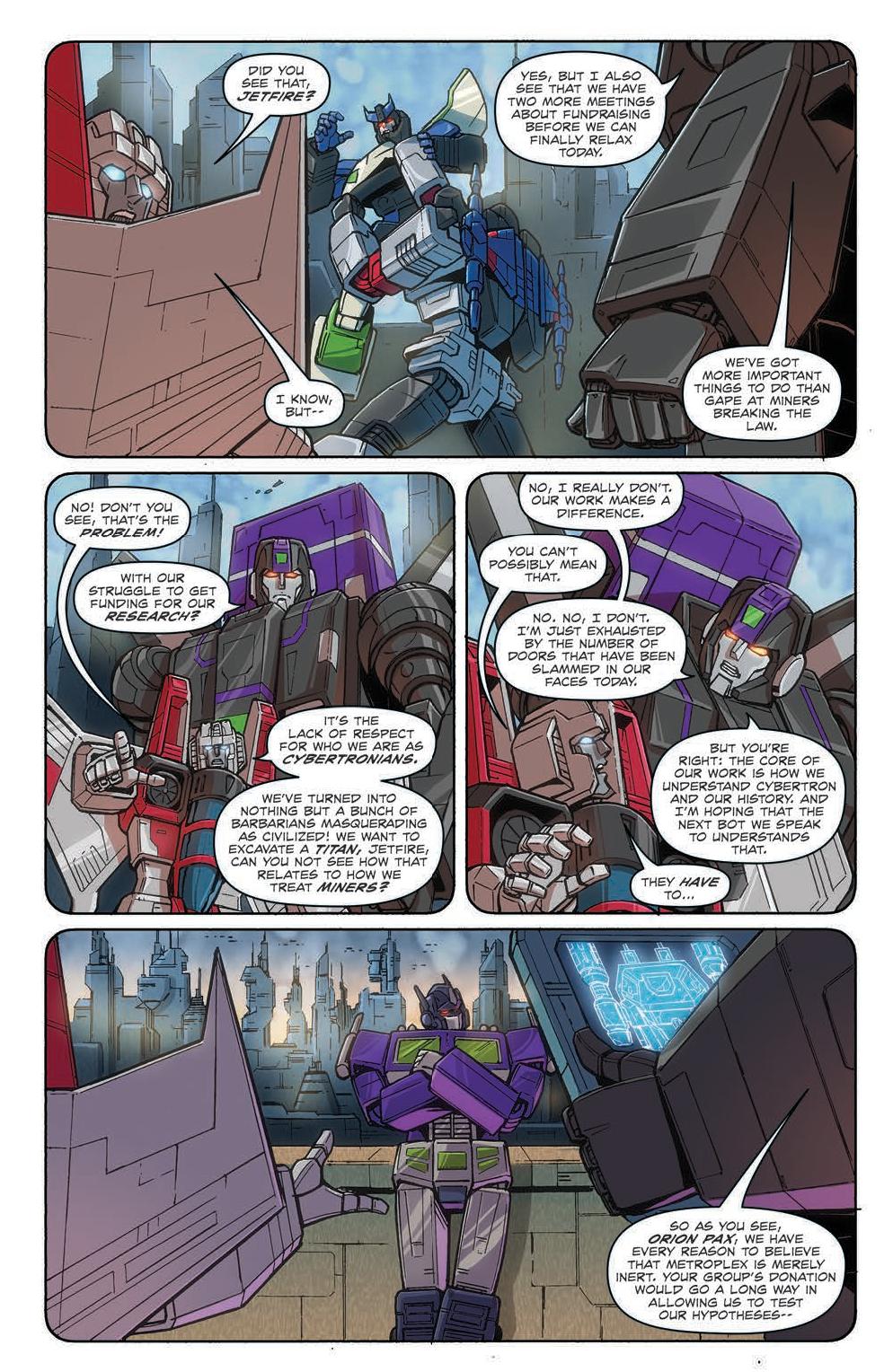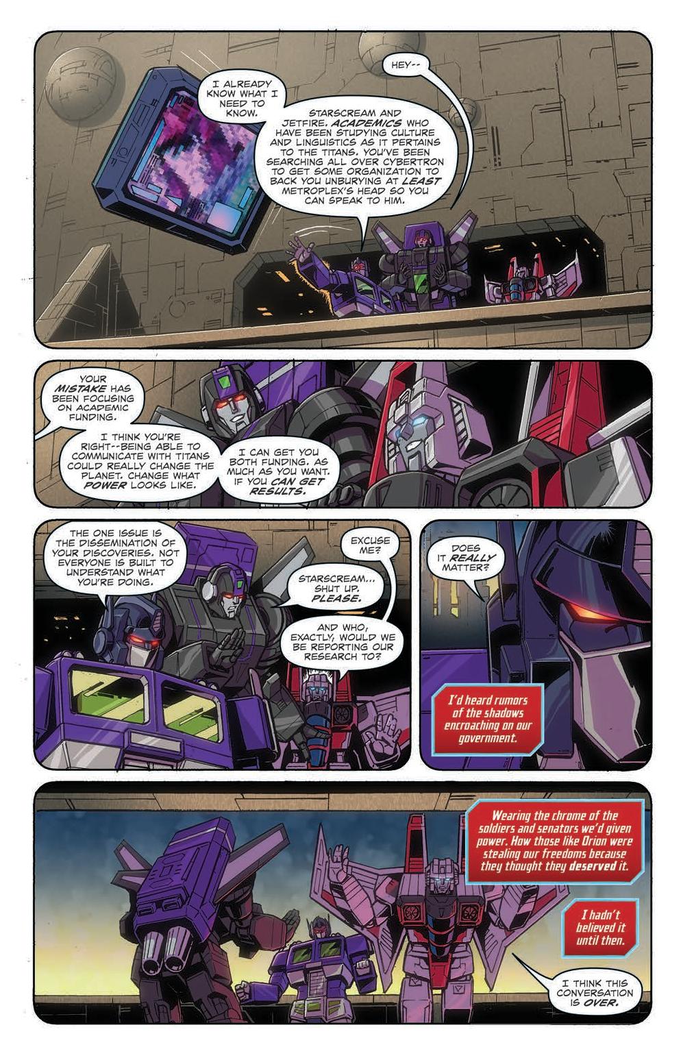 In issue #3, Starscream seeks out more Decepticons to prevent another war that could destroy Cybertron, but memories of the past haunt every step. As the Autobots close in, Starscream must decide between peace for his planet and his former best friend.