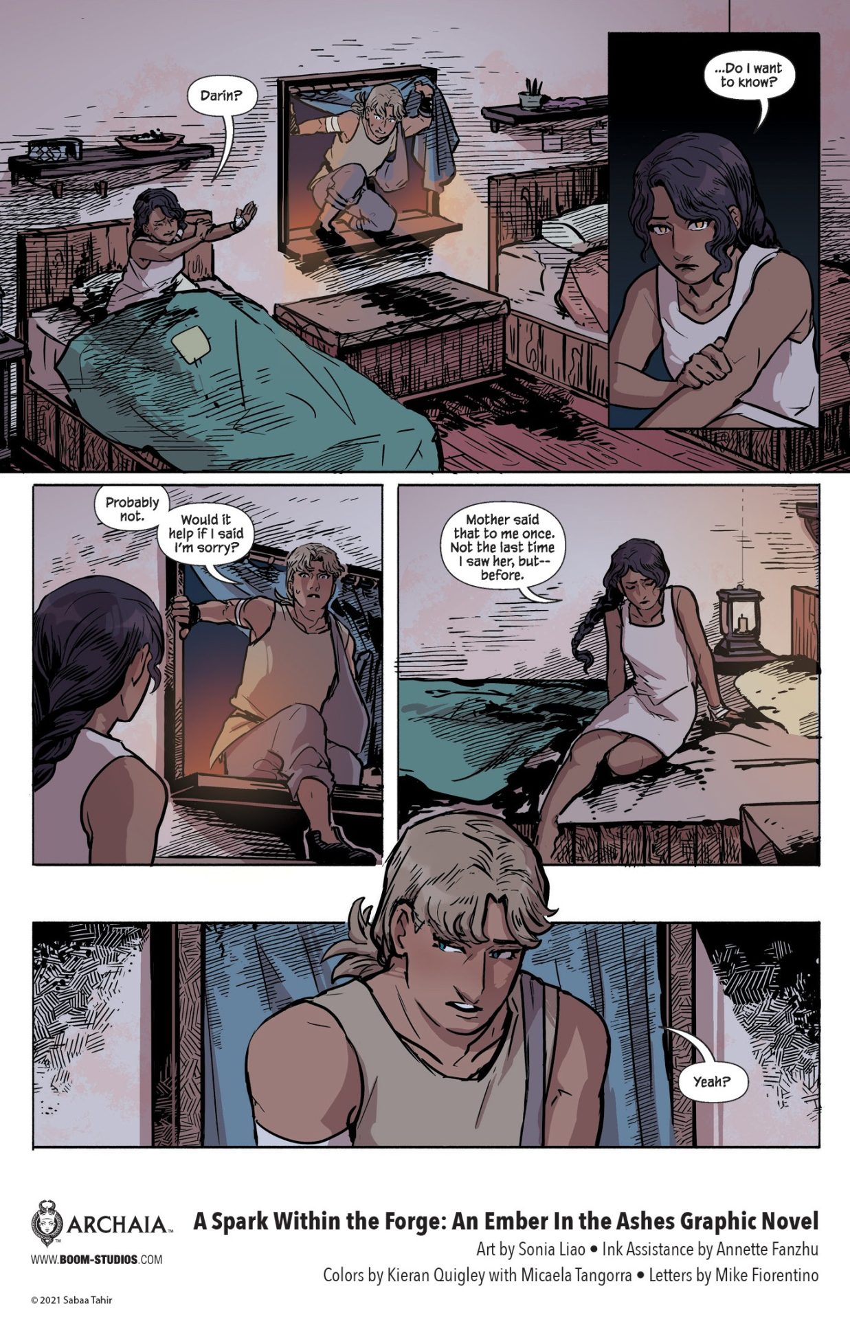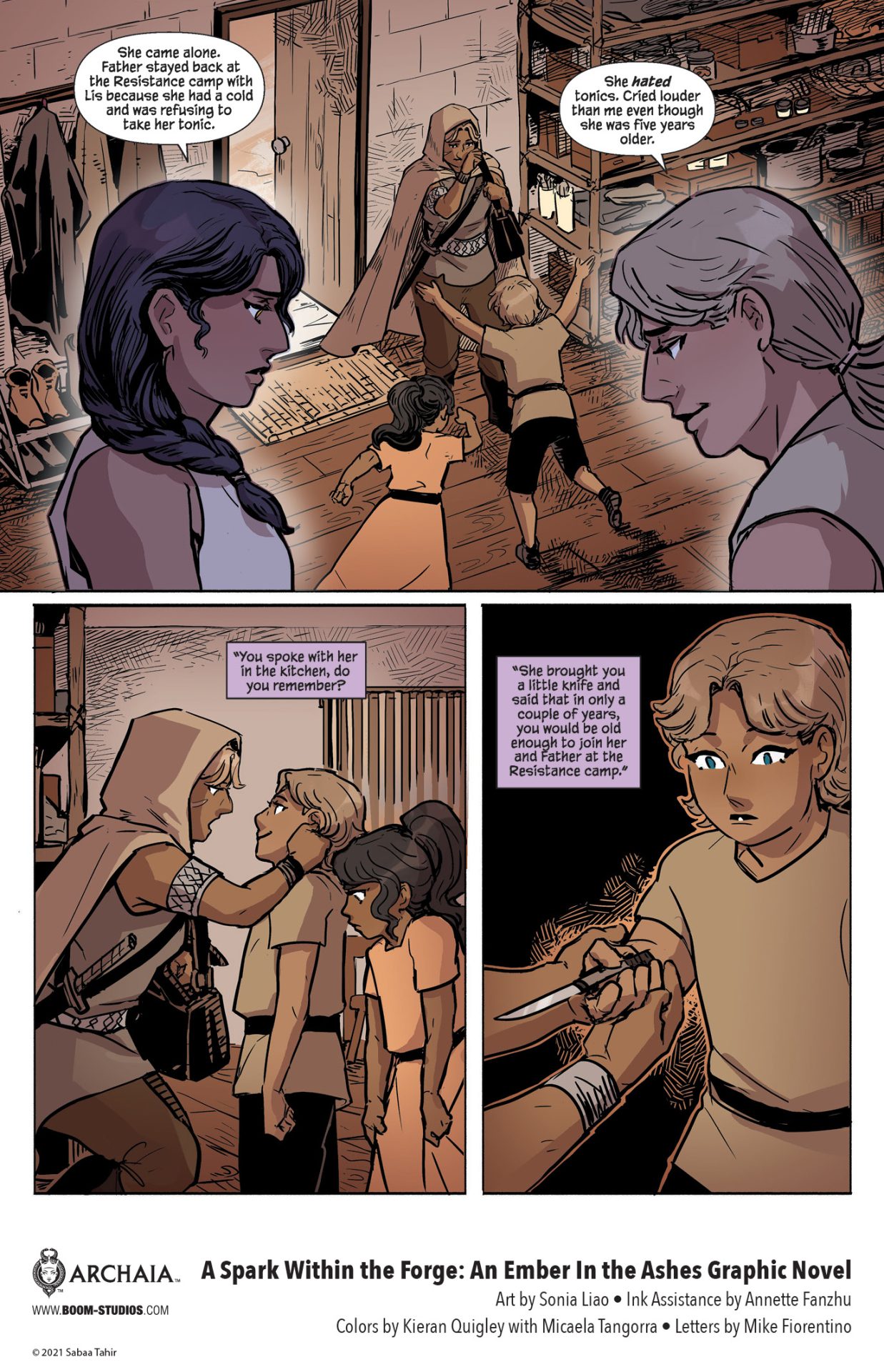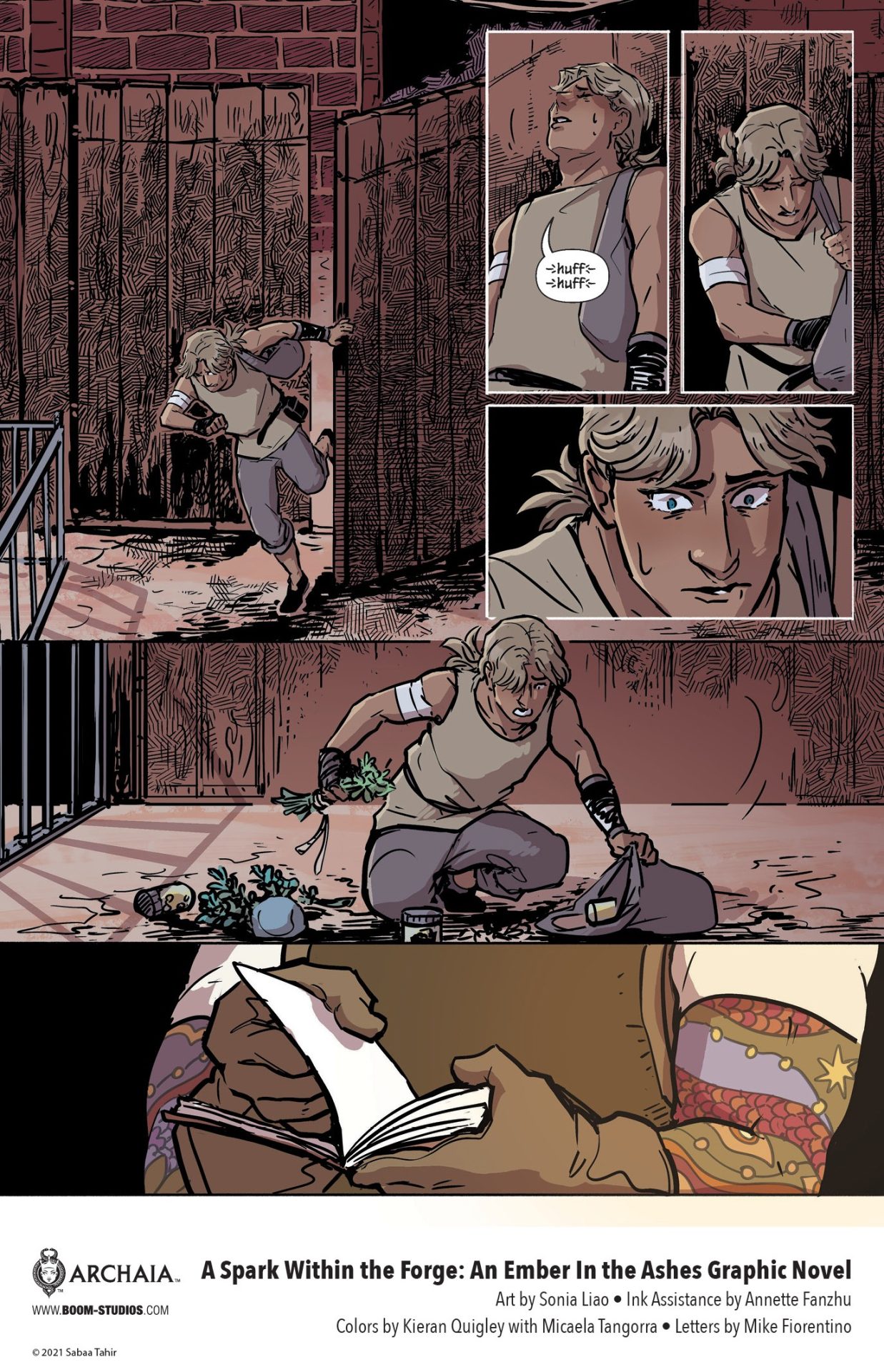BOOM! Studios has revealed a new look at A Spark Within the Forge: An Ember in the Ashes Graphic Novel, an official prequel to the New York Times bestselling series of novels from creator Sabaa Tahir, writer Nicole Andelfinger, artist Sonia Liao, colorist Kieran Quigley, and letterer Mike Fiorentino. A Spark Within the Forge will be the second graphic novel in a three volume prequel series that will explore the pasts of beloved An Ember in the Ashes series characters.