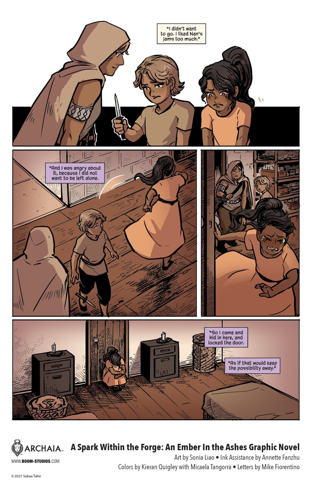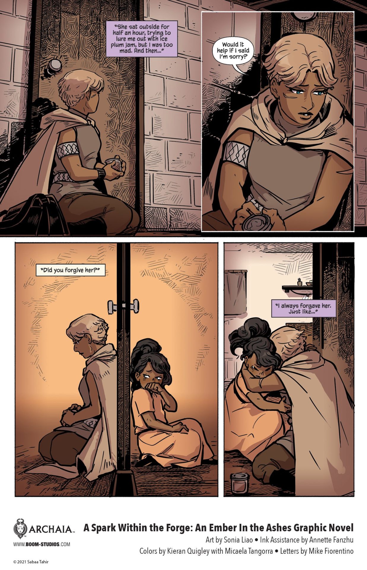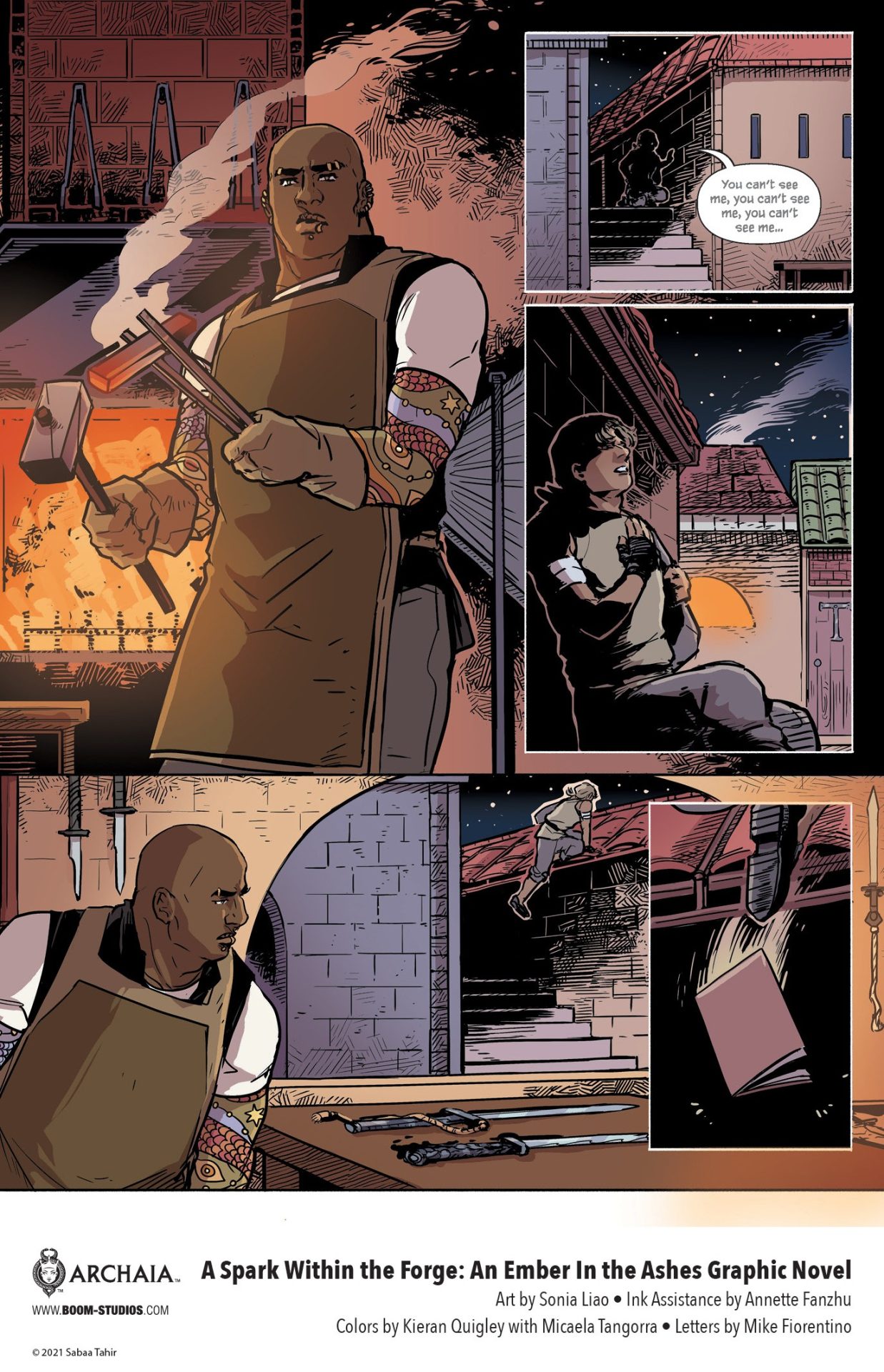 BOOM! Studios has revealed a new look at A Spark Within the Forge: An Ember in the Ashes Graphic Novel, an official prequel to the New York Times bestselling series of novels from creator Sabaa Tahir, writer Nicole Andelfinger, artist Sonia Liao, colorist Kieran Quigley, and letterer Mike Fiorentino. A Spark Within the Forge will be the second graphic novel in a three volume prequel series that will explore the pasts of beloved An Ember in the Ashes series characters.