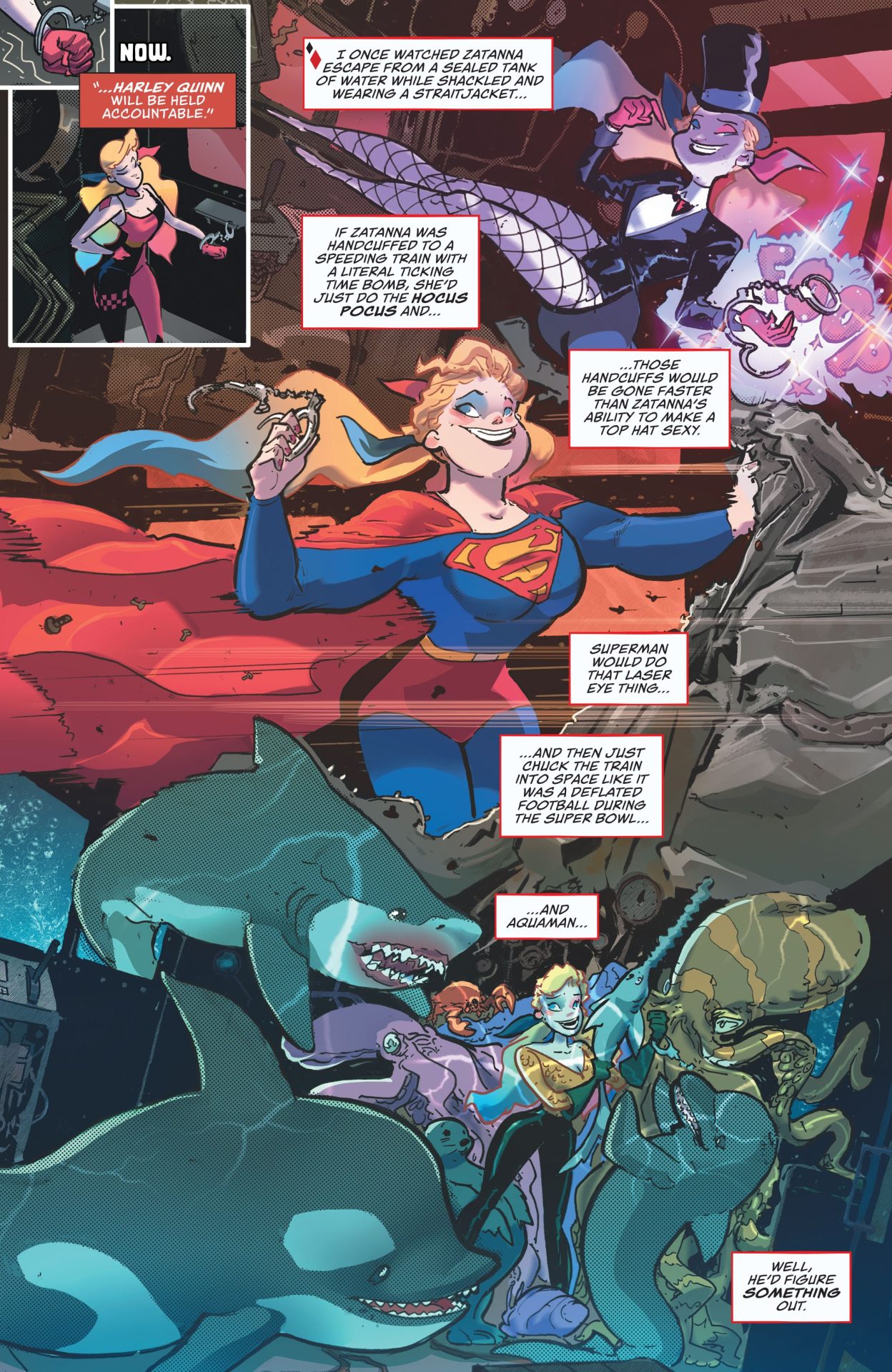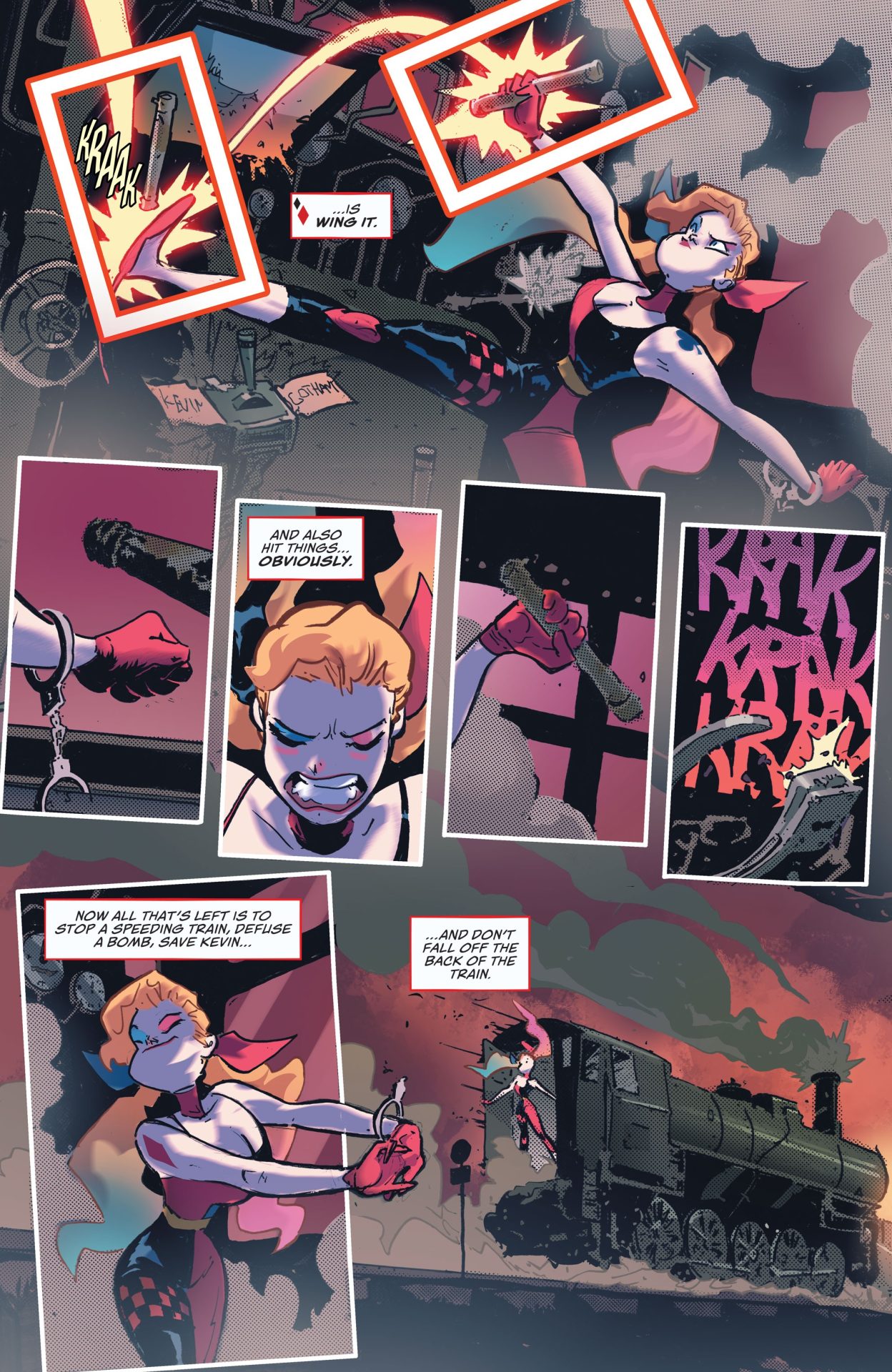 If Superman had to deal with a bomb on a runaway train barreling toward Gotham, he’d just throw the whole thing into outer space like a football. Zatanna would do some cool magic thing. Aquaman would, like, summon an army of bomb-defusing dolphins or something. But I’m Harley Quinn…and I can’t do any of those things. So how am I gonna defuse the bomb, save Kevin, and stop Keepsake from destroying Gotham? Well…I’m workin’ on it, okay? Don’t rush me! But I’ve definitely, certainly, without a doubt got it handled. Probably.