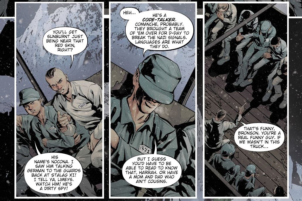 A Native American soldier called Nocona emerges as the main character in all this, a code-talker that speaks several languages and that represents a whole group of First Nations servicemen that the American military enlisted to transmit coded messages during the war (codes the Germans didn’t know how to crack). His knowledge of languages figure greatly into the story and it’s one of the things that help make the vampire a deeper and more frightening character.