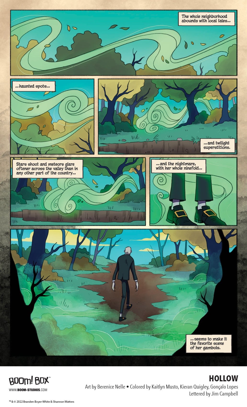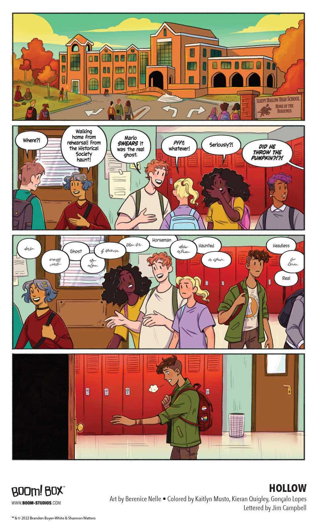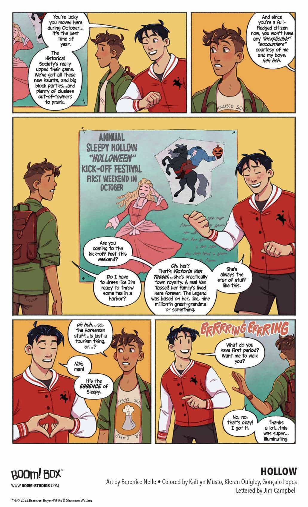 BOOM! Studios has revealed a first look at the brand new original graphic novel, Hollow. From Shannon Watters, the co-creator of the bestselling worldwide phenomenon Lumberjanes, and co-writer debut author Branden Boyer-White, rising star artist Berenice Nelle, and colorists Kaitlyn Musto, Kieran Quigley, and Gonçalo Lopes, comes a supernatural queer romance and adventure set in the infamous town of Sleepy Hollow, available on September 28, 2022.