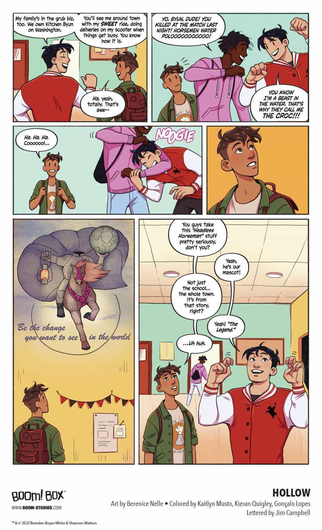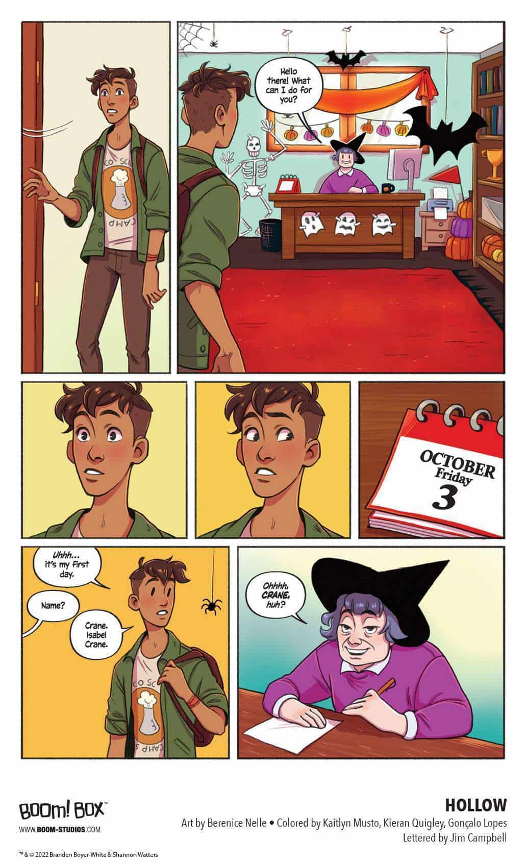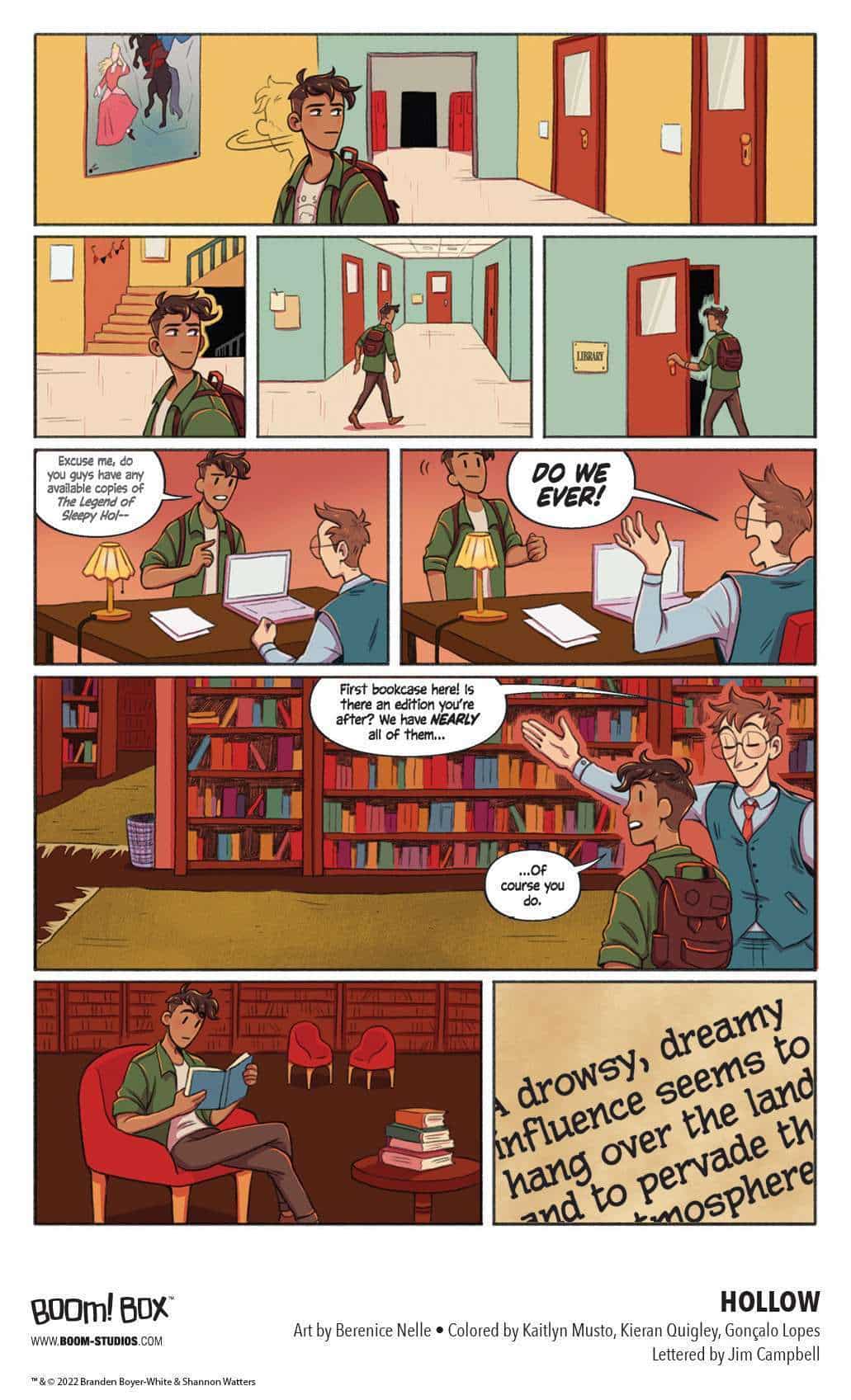 BOOM! Studios has revealed a first look at the brand new original graphic novel, Hollow. From Shannon Watters, the co-creator of the bestselling worldwide phenomenon Lumberjanes, and co-writer debut author Branden Boyer-White, rising star artist Berenice Nelle, and colorists Kaitlyn Musto, Kieran Quigley, and Gonçalo Lopes, comes a supernatural queer romance and adventure set in the infamous town of Sleepy Hollow, available on September 28, 2022.