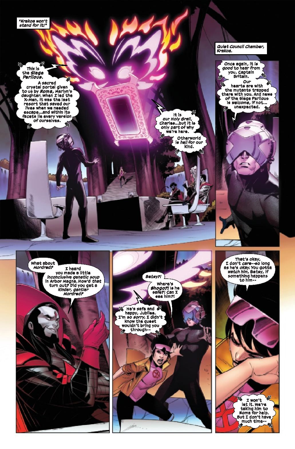 Betsy Braddock has assembled her Knights of X! Their mission: to save Otherworld from Merlyn and his powerful henchmen…by finding the holy grail of mutantkind. But Otherworld is vast, and innumerable armies stand in their way. When Merlyn targets the Crooked Market, a safe haven for mutantkind, the Knights must split up. Will Captain Britain find the grail? Will Gambit lead the others into a deadly trap? Death looms over the Knights – in more ways than one.