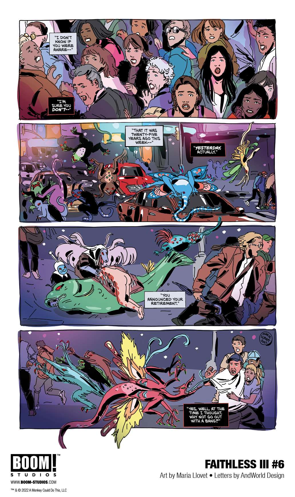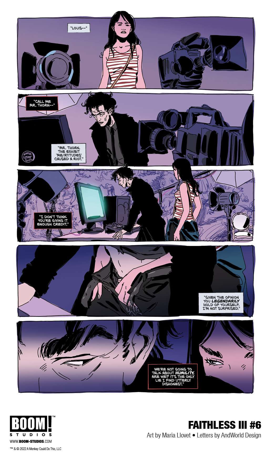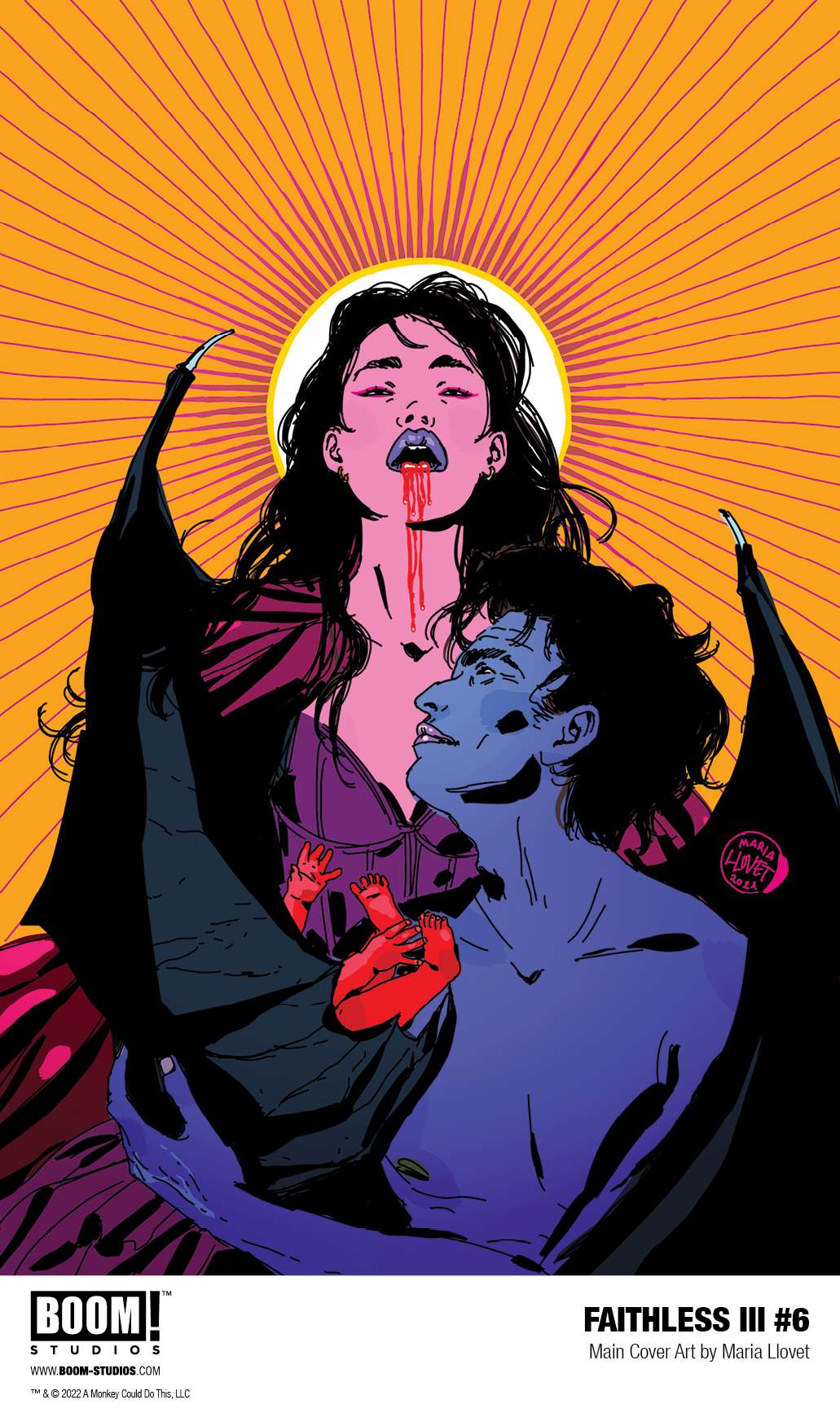 BOOM! Studios has revealed a first look at Faithless III #6, the final issue of the six-issue sequel series, from acclaimed team of New York Times bestselling writer Brian Azzarello, acclaimed artist Maria Llovet, and letterer AndWorld Design, as Faith mysteriously reappears on the art scene with a hidden secret that spells disaster and damnation for everyone, in this explosive end to the cult hit series, available on July 20, 2022.