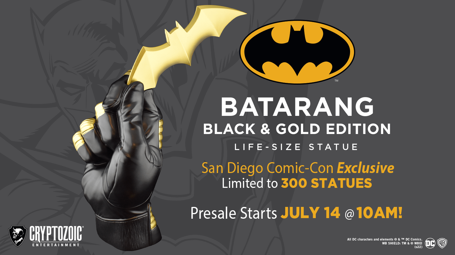 - July 14, 2022 at 10 am PT: Go to this page to purchase Batman Batarang Statue: Black & Gold Edition for pickup at Booth #115 at SDCC 2022!