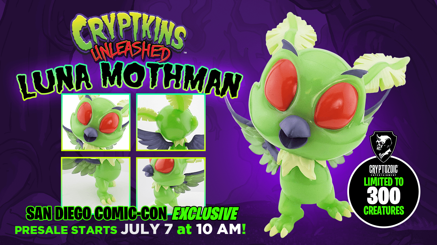 Like the moon, she’ll light up the night! Here’s your chance to own the Luna Mothman Cryptkins Unleashed vinyl figure created exclusively for San Diego Comic-Con 2022 (July 21-24). Buy it during the presale and pick it up at Cryptozoic’s Booth #115 during the show.