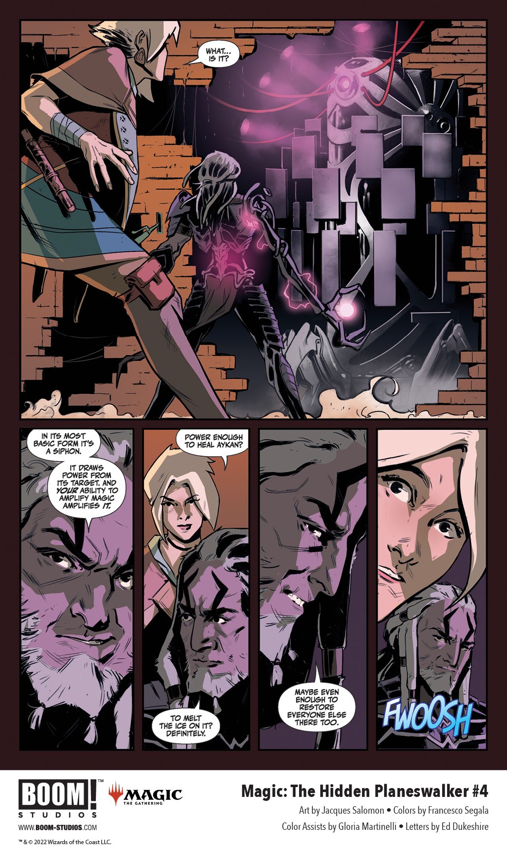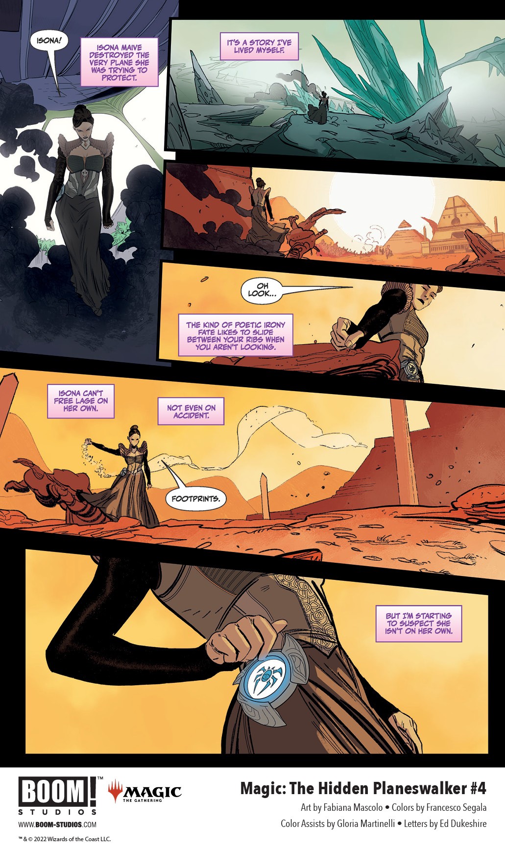 BOOM! Studios has released the first look at Magic: The Hidden Planeswalker #4, the final issue in the four-issue series from comic and screenwriter Mairghread Scott, artists Fabiana Mascolo and Jacques Salomon, colorist Francesco Segala with Gloria Martinelli, and letterer Ed Dukeshire, about the deadly Liliana Vess and the hidden planeswalker she discovers who will change the fate of the entire multiverse forever, available on July 27, 2022.