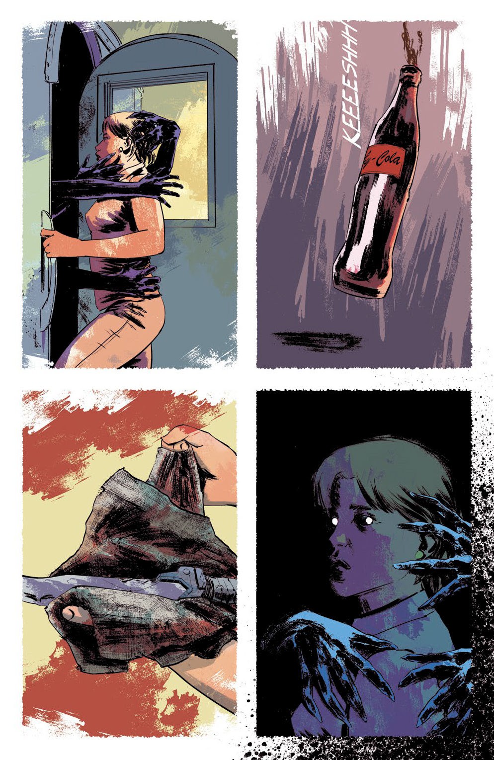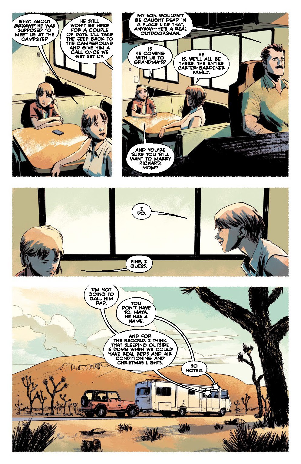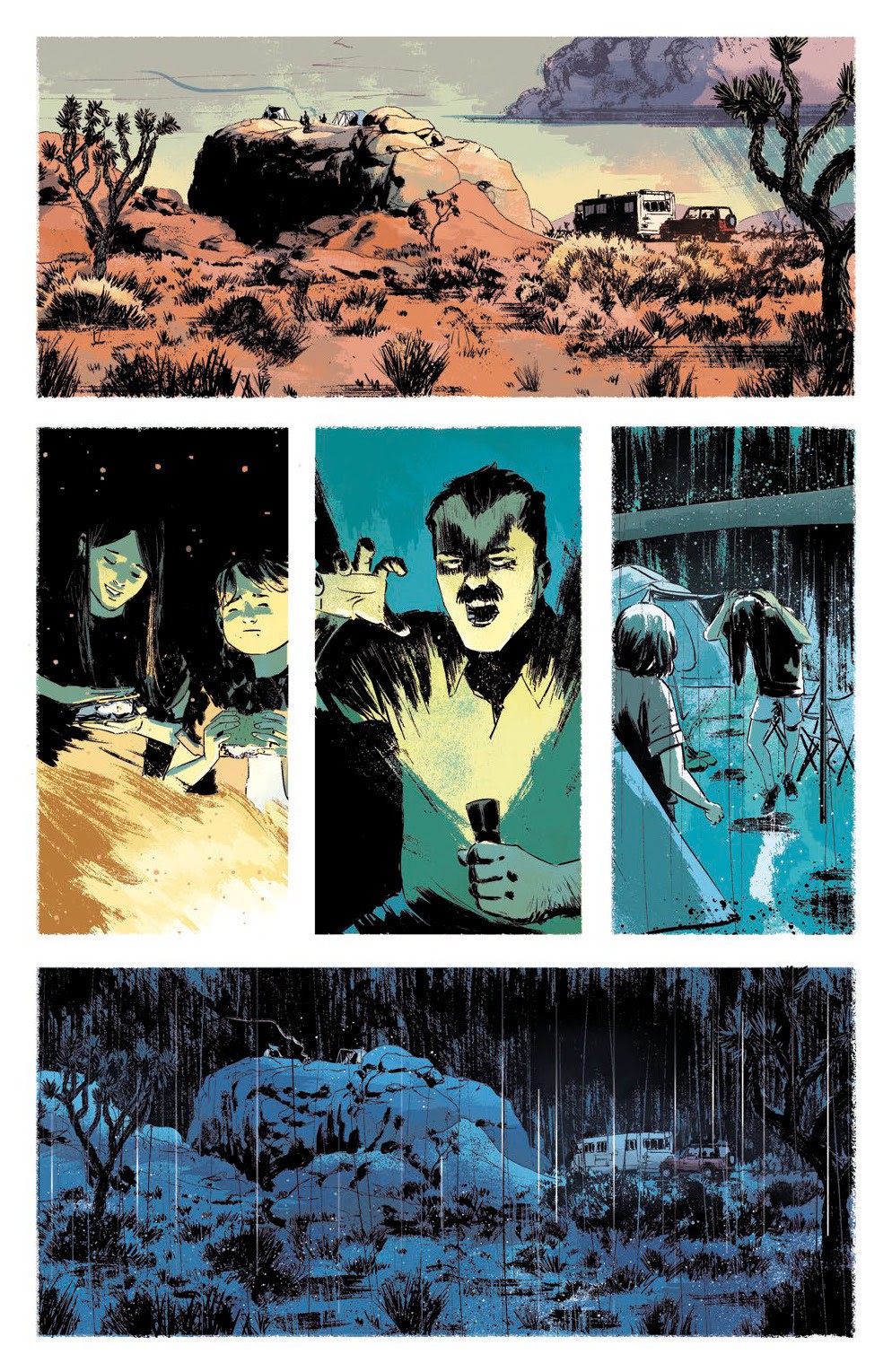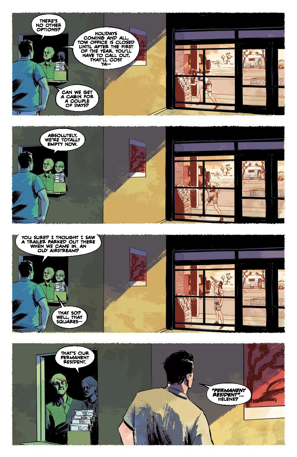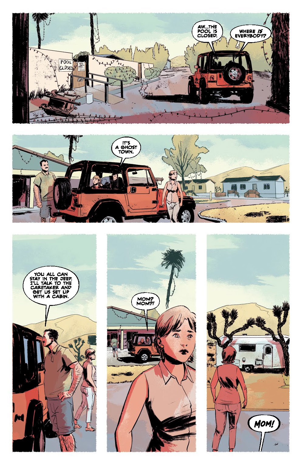 Feature two is Denizen, written by Tim Daniel and David Andry, drawn by Chris Shehan, colored by Jason Wordie, and lettered by Jim Campbell. A family’s cross country road trip goes off the map and into the unforgiving wilds of Joshua Tree National Park, when mom and wife-to-be Helene succumbs to a malevolent force tucked inside an abandoned camping trailer.