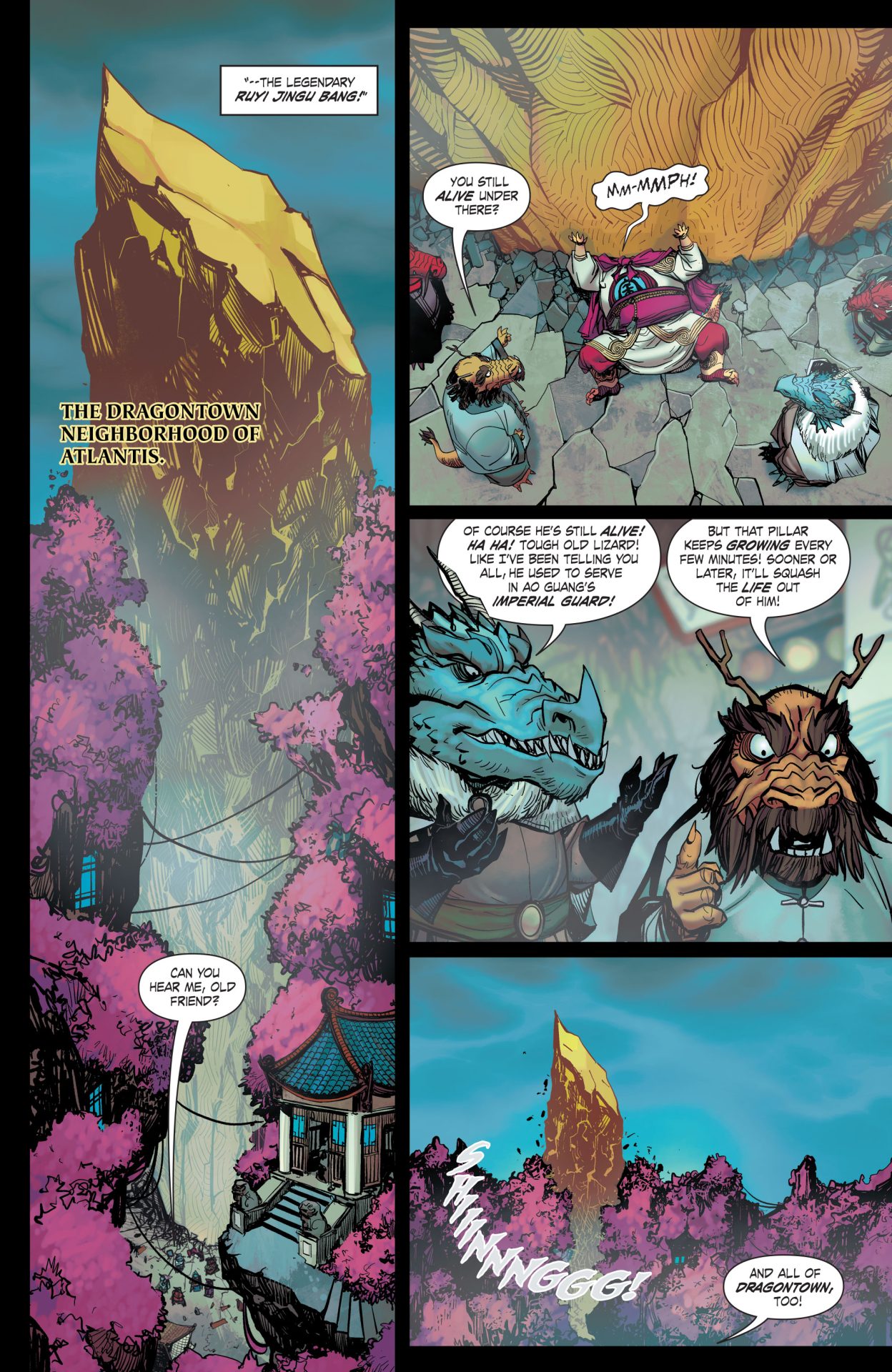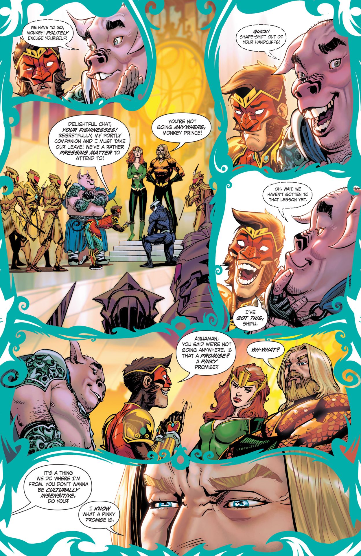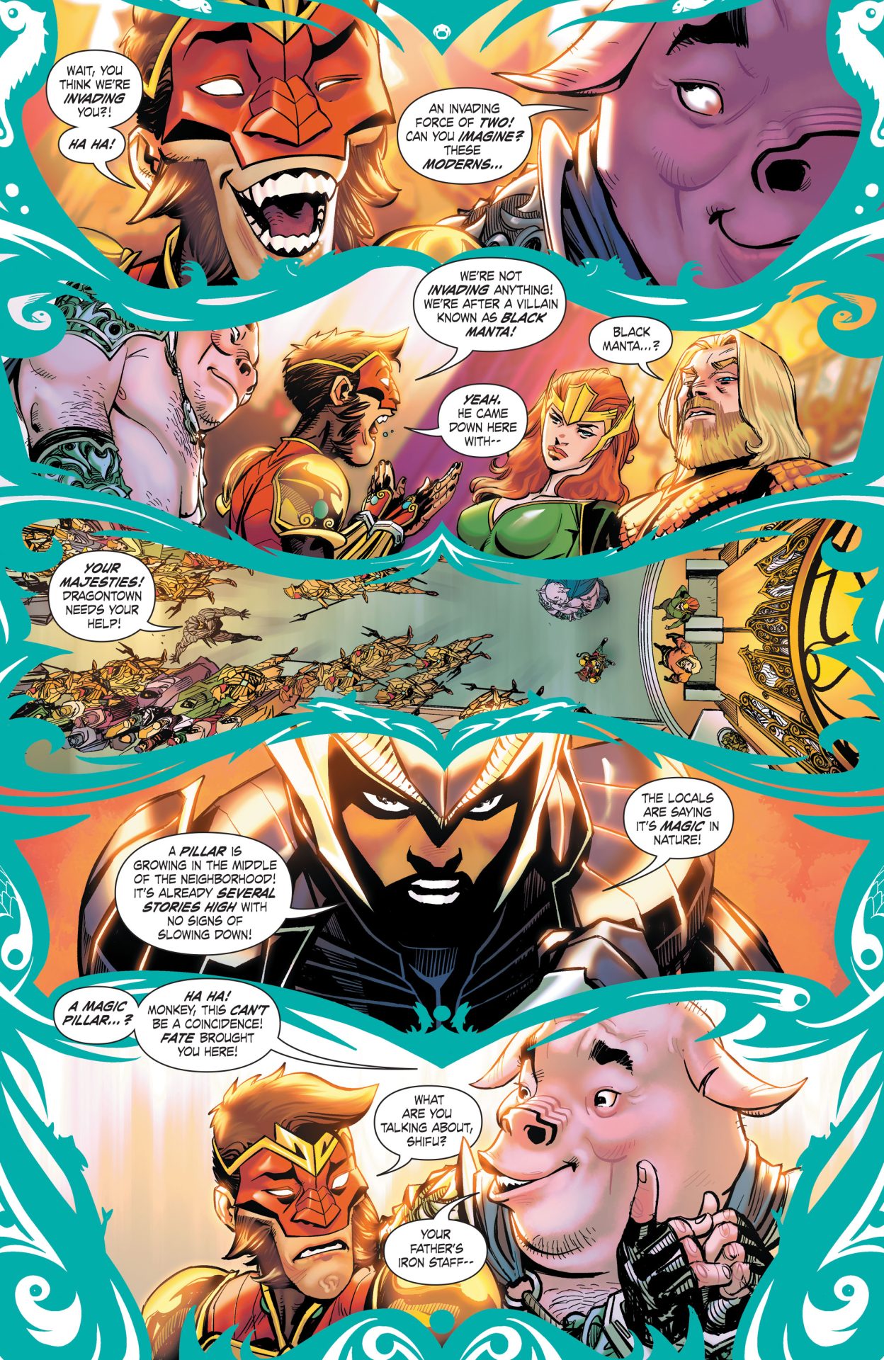 The Jingu bang has stretched so large and long that it has become a nuisance to Atlantis, and so Aquaman goes to find who is responsible for this ginormous golden staff that destroyed so much of his city. The good news is, the Jingu bang can shrink back to normal size, but only the Monkey King is worthy enough to wield its magical properties-will the staff recognize Monkey Prince as good enough to do the same?