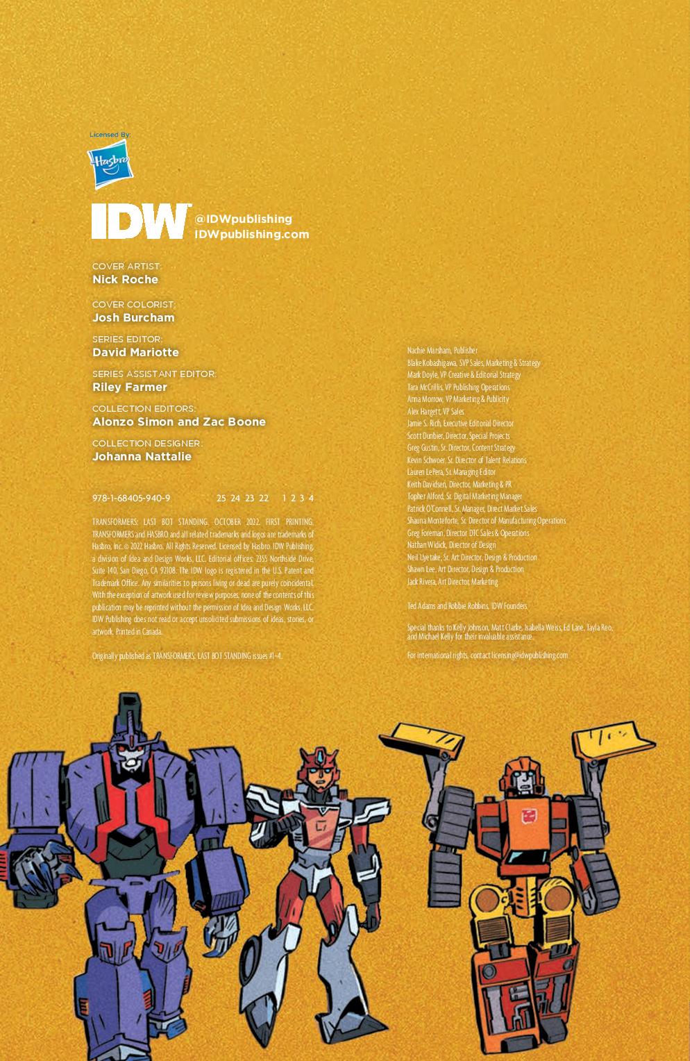 The planet Donnokt sits on the edge of the universe, far away from all the stars that are flickering and fading out. It is a world on the precipice of revolution-industrialization-taking its first steps into the realms of the mechanical. When Visitors arrive on this far edge of nowhere, they threaten to reveal the secret Rodimus has given up his life to protect. With carnivorous mechanical lifeforms threatening its inhabitants’ very existence, Donnokt will never be the same again. But its protector has one last job to do: can he rid the world of the Visitors or will someone else be the Last Bot Standing?