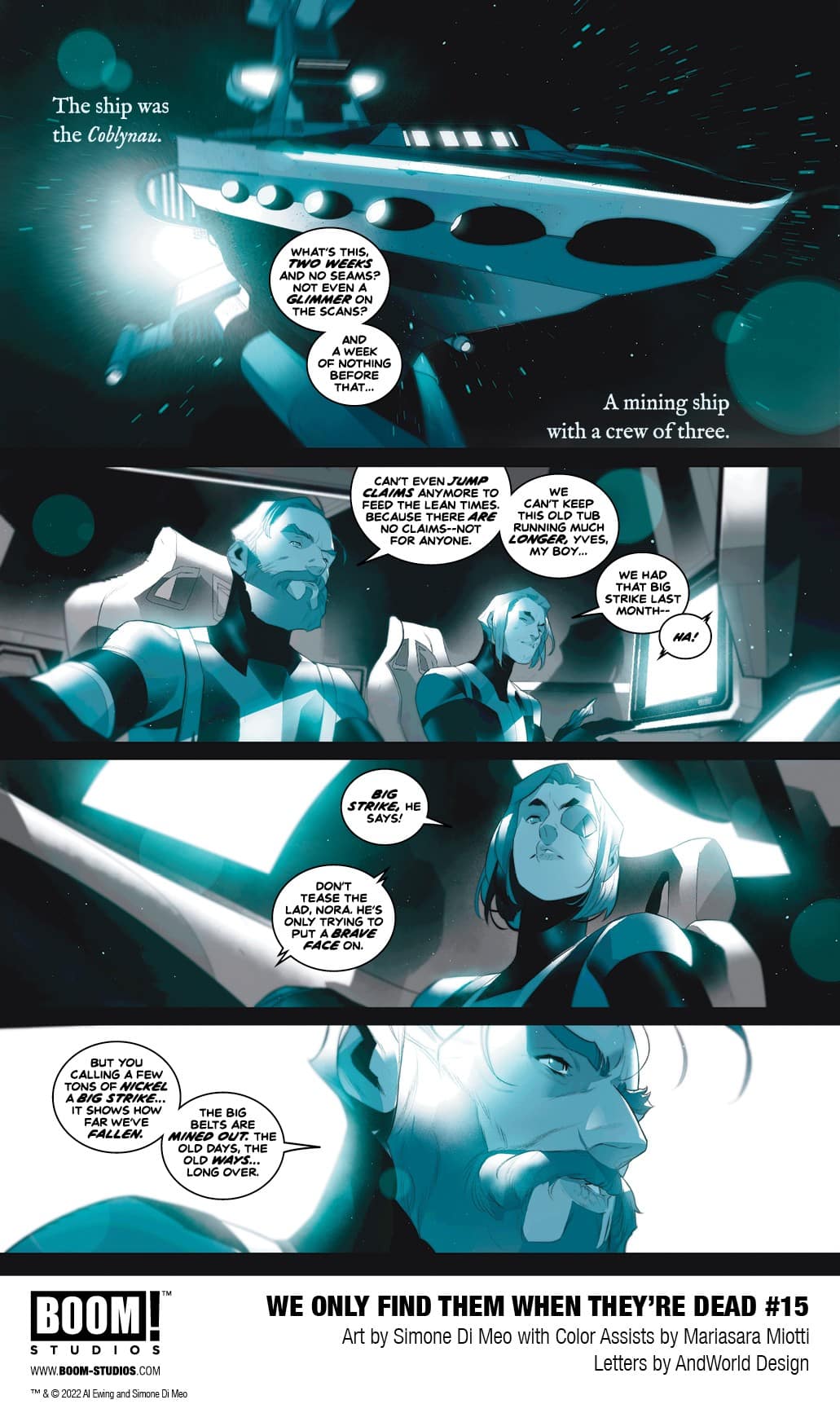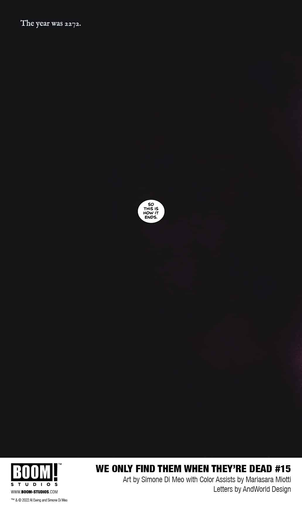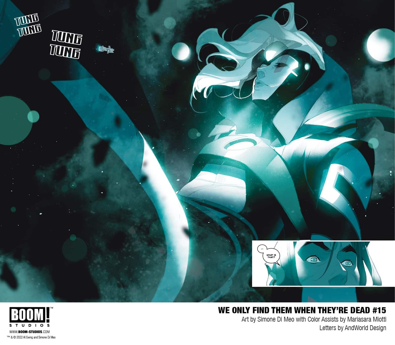 BOOM! Studios has revealed a first look at We Only Find Them When They’re Dead #15, the final issue in the highly acclaimed sci-fi epic from superstar creators Al Ewing and Simone Di Meo with color assistance by Mariasara Miotti, and letterer AndWorld Design, set in a universe that revolves around mining the corpses of dead gods and a conflict that threatens to tear apart the galaxy. Available on December 28, 2022.