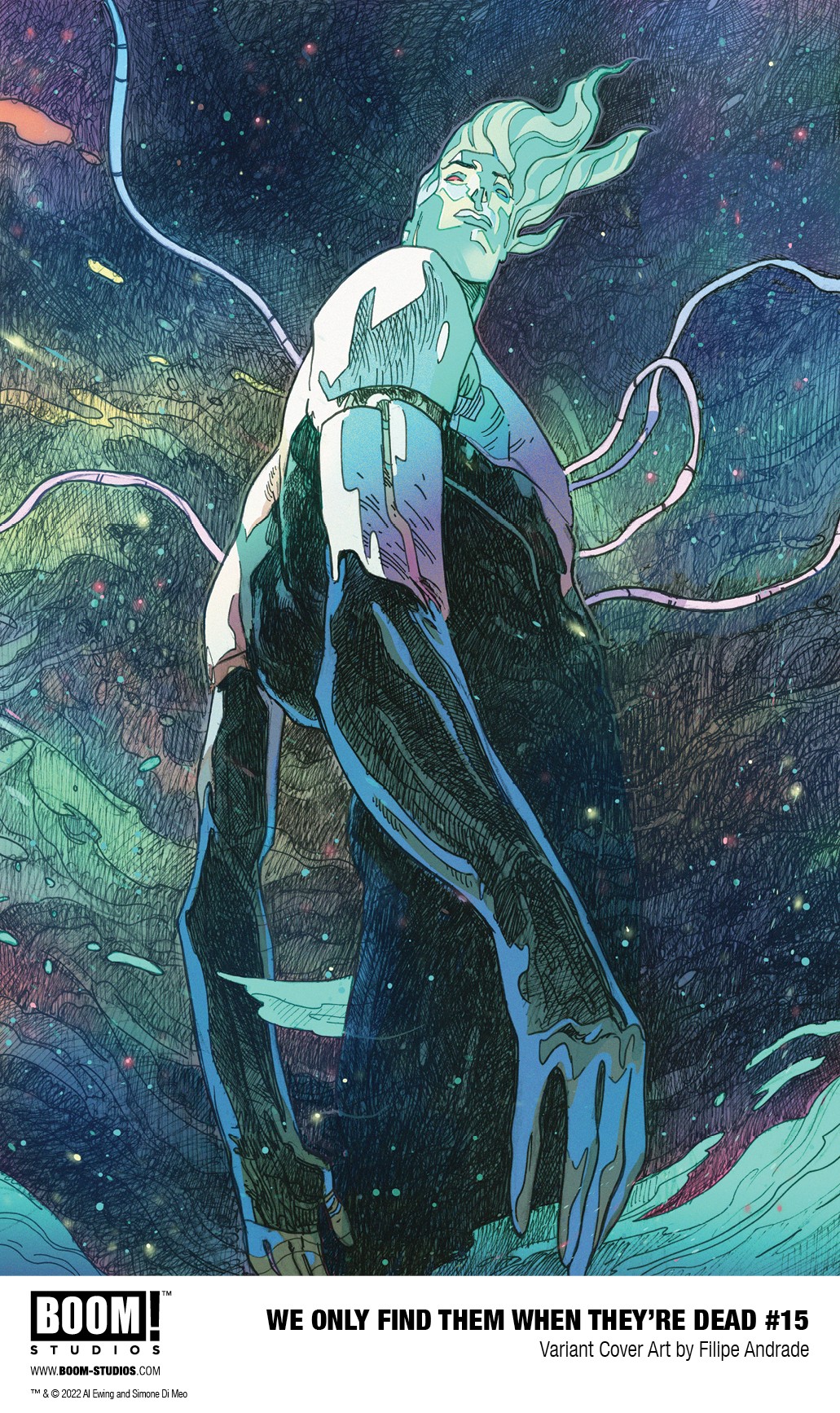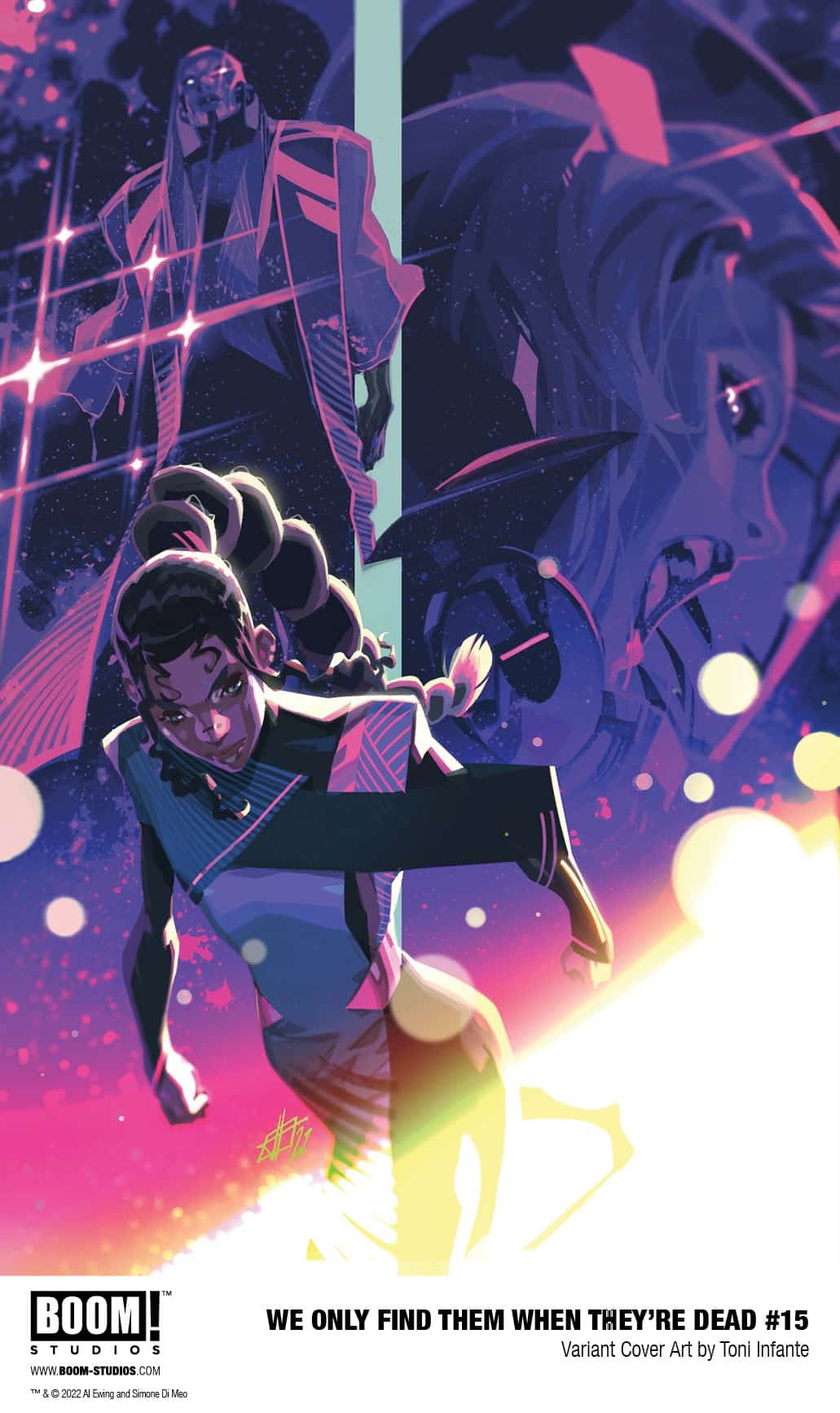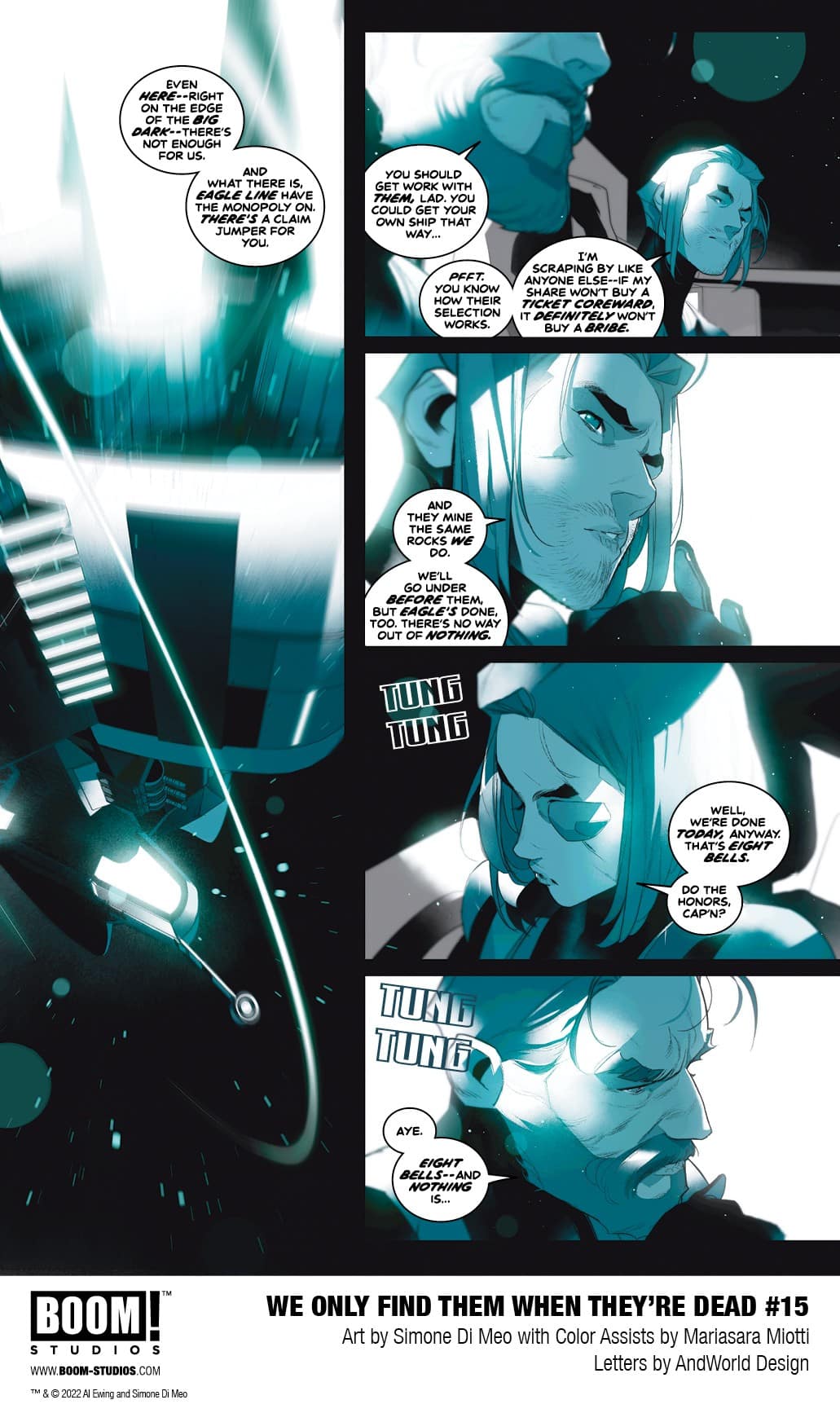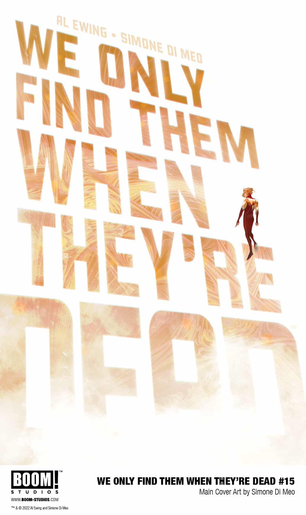 BOOM! Studios has revealed a first look at We Only Find Them When They’re Dead #15, the final issue in the highly acclaimed sci-fi epic from superstar creators Al Ewing and Simone Di Meo with color assistance by Mariasara Miotti, and letterer AndWorld Design, set in a universe that revolves around mining the corpses of dead gods and a conflict that threatens to tear apart the galaxy. Available on December 28, 2022.