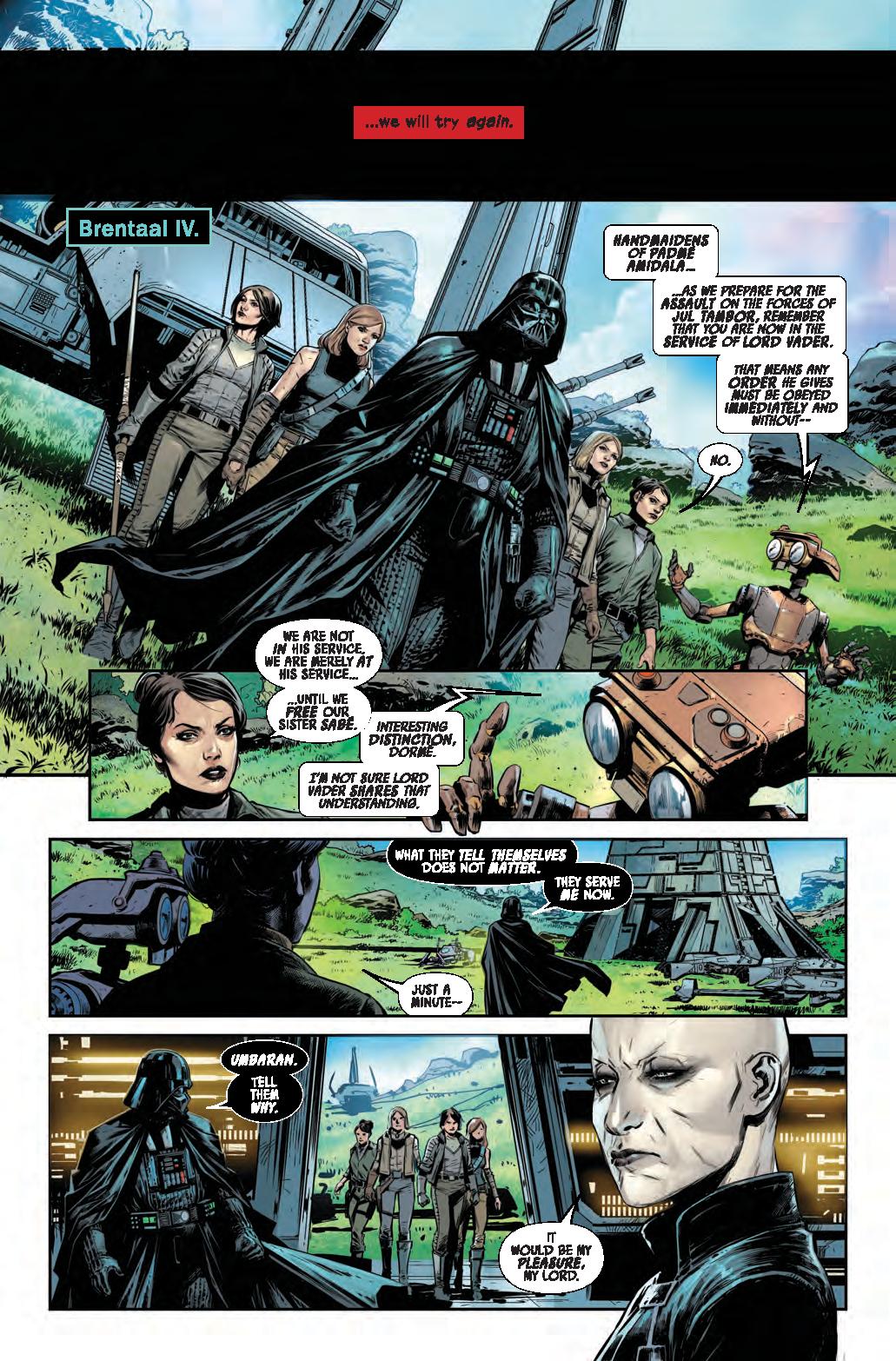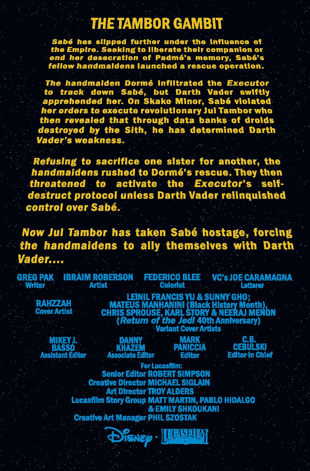 The Dark Lord finally comes face-to-face with Skakoan revolutionary Jul Tambor – and Sabé finally must pick sides! Is Jul just another selfish, revenge-driven monster? Or is he a freedom fighter who desperately cares about his people? Or both? And is Vader more interested in crushing Jul-or completing the co-option of the Handmaidens of Padmé Amidala?