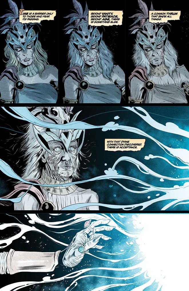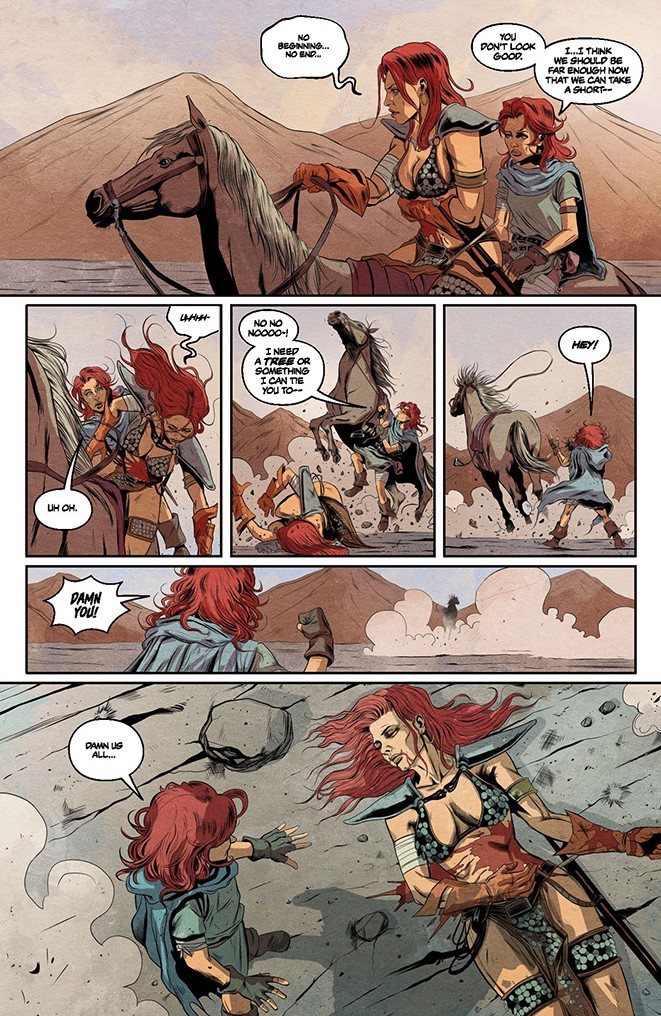 Within the decaying ruins of Admir-Yun, Sonja and her unexpected new companion search for the answers to their strange shared fate. What they find within could change the Hyborian Age forever!
