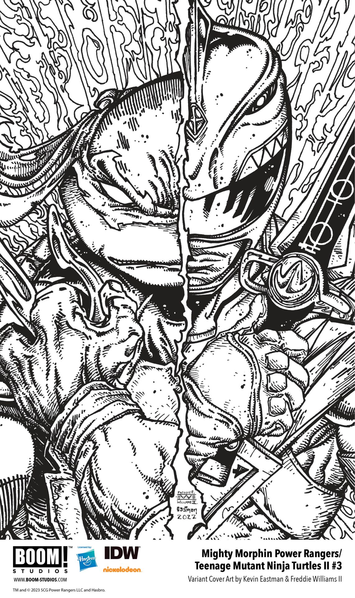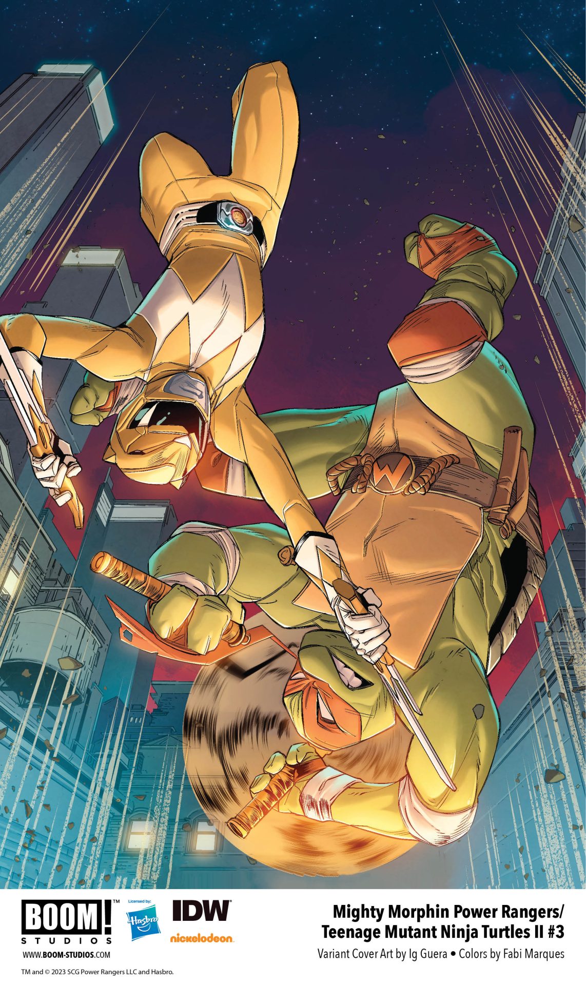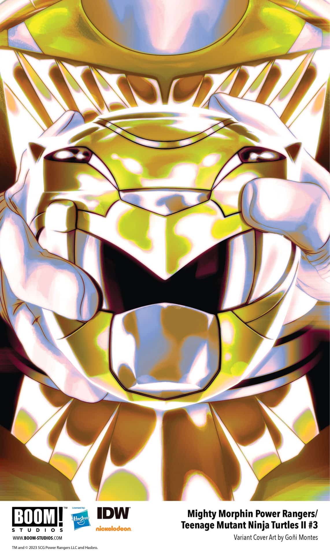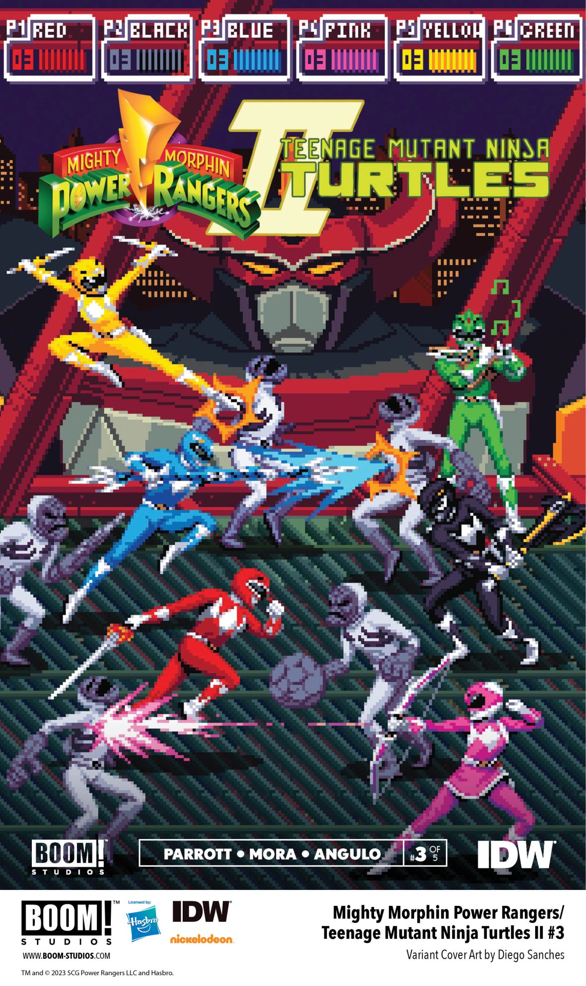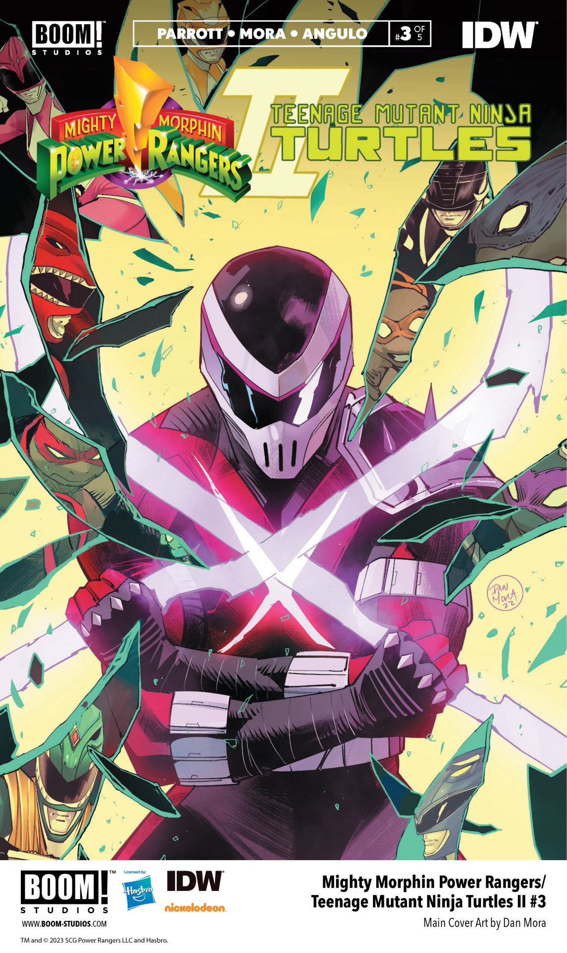Mighty Morphin Power Rangers/Teenage Mutant Ninja Turtles II #3 features main cover art by Dan Mora and variant covers by acclaimed illustrators Kevin Eastman & Freddie Williams II with Andrew Dalhouse, Diego Sanches, Taurin Clarke, Ig Guara with Fabi Marques, Paolo Rivera, Simone di Meo, Alan Quah, Michael Dialynas, and Goñi Montes.