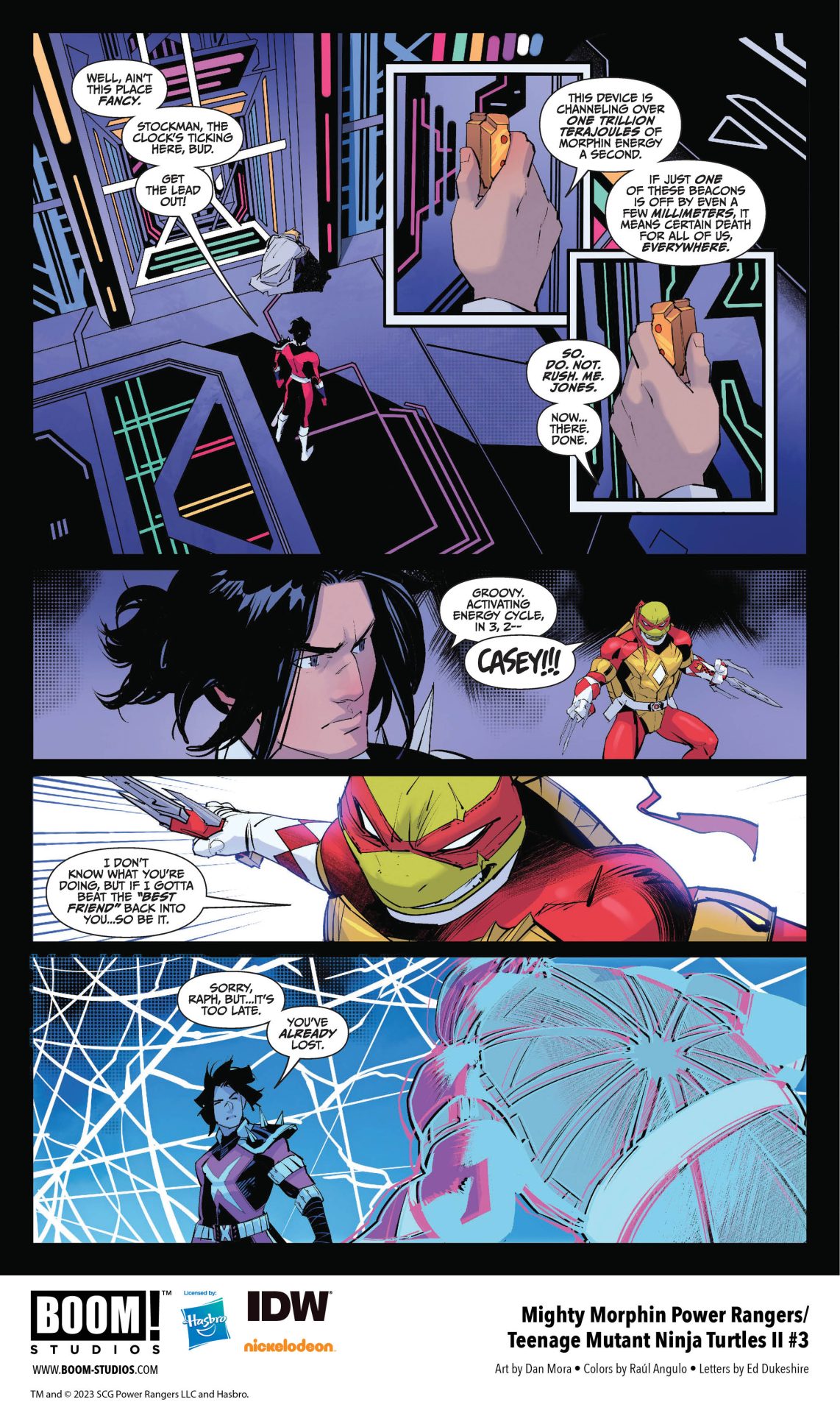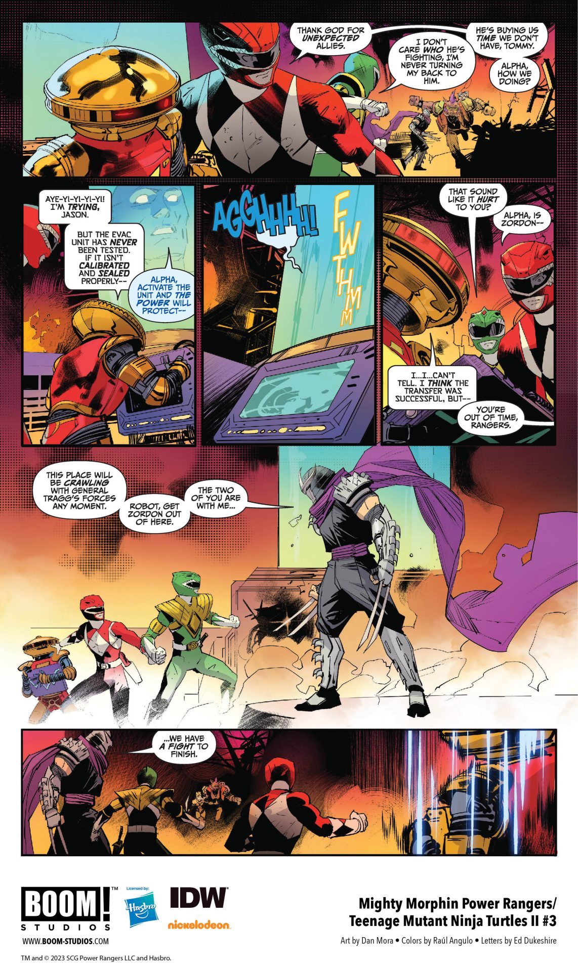 BOOM! Studios has revealed a first look at Mighty Morphin Power Rangers/Teenage Mutant Ninja Turtles II #3, the next issue of the highly anticipated sequel comic book series from acclaimed writer Ryan Parrott, fan-favorite artist Dan Mora, colorist Raúl Angulo, and letterer Ed Dukeshire. The sequel comic book series continues in the world of the hit crossover in the all-new adventure with fan-favorite teen fighting teams on February 22, 2023.