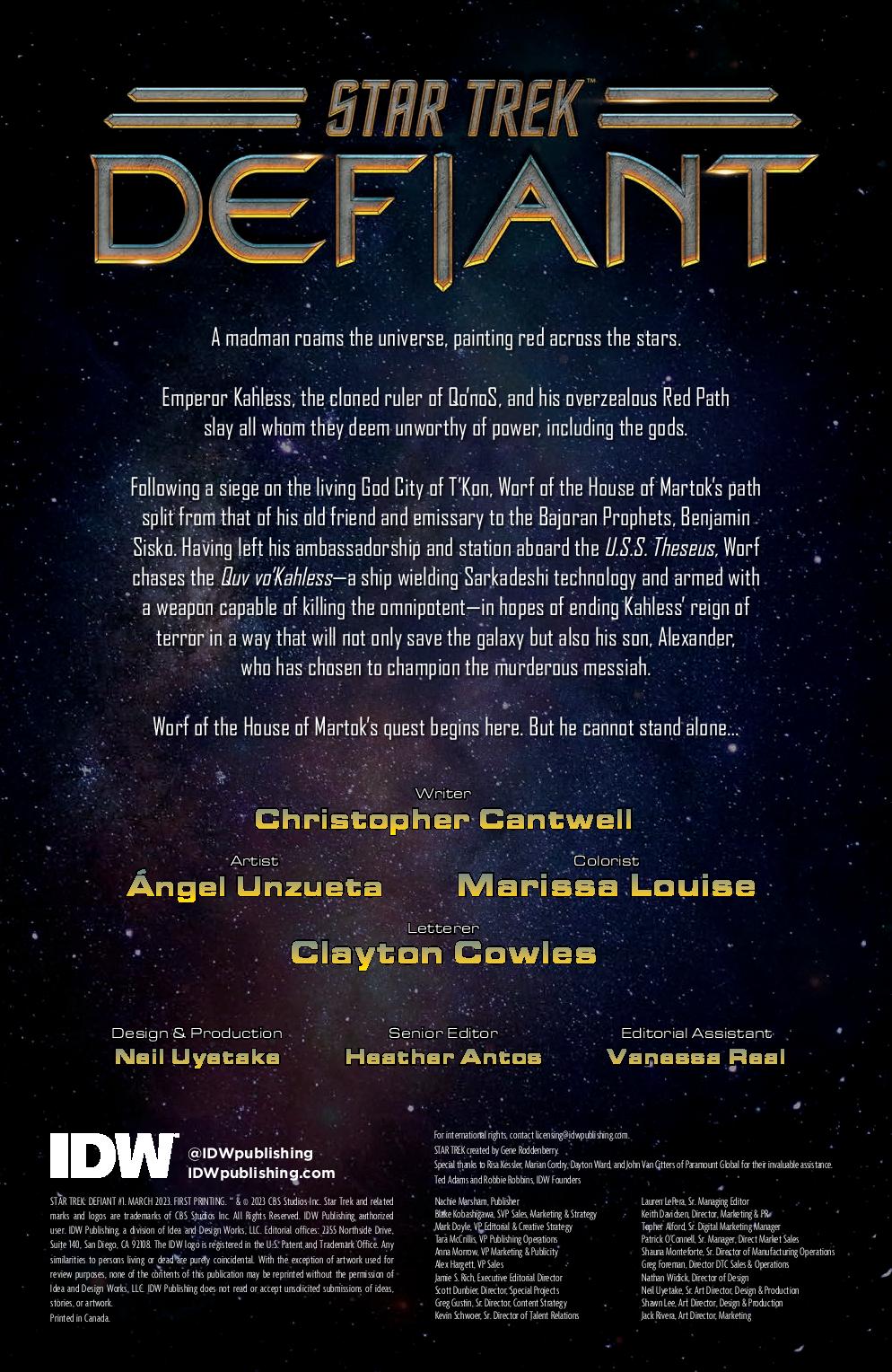A brand-new series comes spinning directly out of the hit Star Trek comic book! Someone is killing the gods. But Benjamin Sisko’s Prophets-guided dealings of the higher cosmos has led him to forget about the very real casualties on lower ground. The enemy is a man, not a god. And Worf of House Martok has put together his own crew aboard the U.S.S. Defiant in hopes of defeating the dangerous messiah behind this genocidal cult. The Dirty Dozen meets Star Trek in this new series from the creative mind of Chris Cantwell and drawn by Angel Unzueta! Star Trek: Defiant is the first expansion of IDW’s exciting new Star Trek initiative that started with the 400th issue and carries on into a bold new storytelling future!