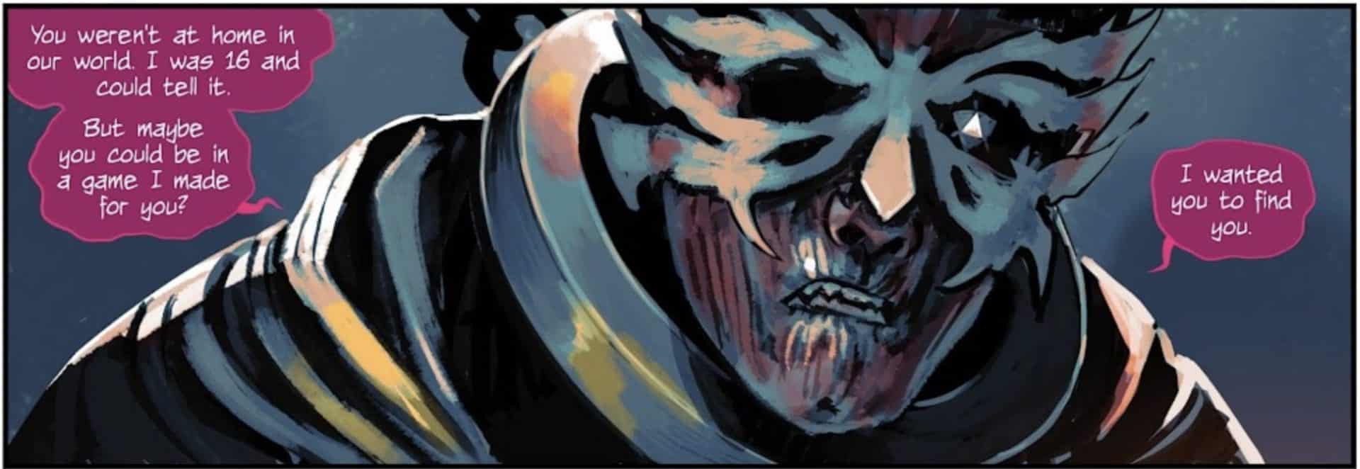 Following their return to the real world as kids, Ash gets married and is expecting a baby. Despite their best attempt to move on from Die, they still feel it is haunting them. While lying in bed next to their wife, Ash thinks, “The easy thing is to say that my fantasy life is private. That’s not true. My fantasy is separate.” Being unable to speak about their childhood experiences mirrors their feelings about being in the closet. Ash believes they have to keep that part of their life compartmentalized and not burden it with their wife. Compared to reality, “Being Ash was always easy. It gave me so many permissions. I enjoyed it.” Gillen and Hans are not making Ash’s desire to be their persona in the game a fetish or view it as a negative thing. It’s an escape to who they genuinely identify as. Being closeted is akin to wearing someone else’s clothes that don’t fit while trying to be “normal.” The desire and the longing to be another person always existed within them, but they were afraid to broach the subject. “But here, everything gets blurred. The real and the not real. Every whim or thought is dragged out of me. I figure…safer to lock it all away” they explain to the party regarding their decision to remain closeted. But the closet can only keep things contained for so long before it bursts wide open.