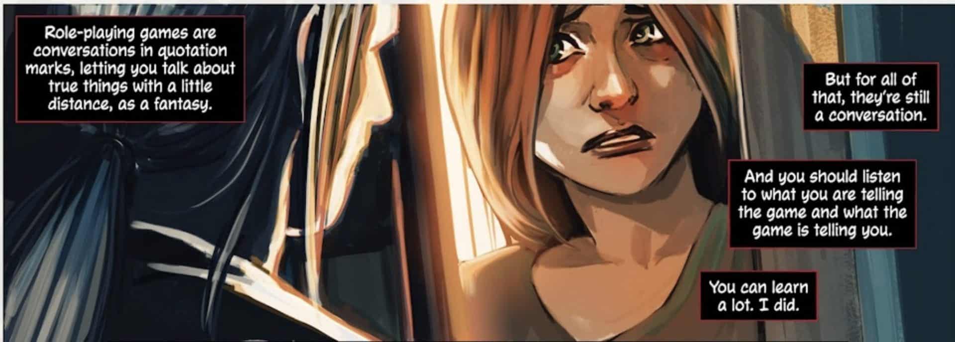 Most of all, I am incredibly grateful to Gillen and Hans for centering the story around a flawed and human queer character. Ash feels extremely real due to being allowed to have flaws, dreams, and fears. More importantly, to have Ash be an adult in their 40s and figure out their gender and sexuality. After they tackle the boss over the ledge, they think about The Chronicles of Narnia and how “If you think about it, all of Narnia is in the closet. And eventually, you have to come out.” A common phrase I tell people is that coming out is never a one-time thing. It’s a constant choice one makes where you must leave behind the closet to live as your true self. Outside of this, it is refreshing to frame the journey of discovering one’s queer identity as a lifelong experience and that it is never too late to come out. “When we were young, we didn’t have words for these complexities.” You don’t always have the correct words or methods to describe yourself when you’re young. Sometimes it takes time. TTRPGs appear to be quite complex on the surface, but it’s pretty simple once you understand the language and the system of it.