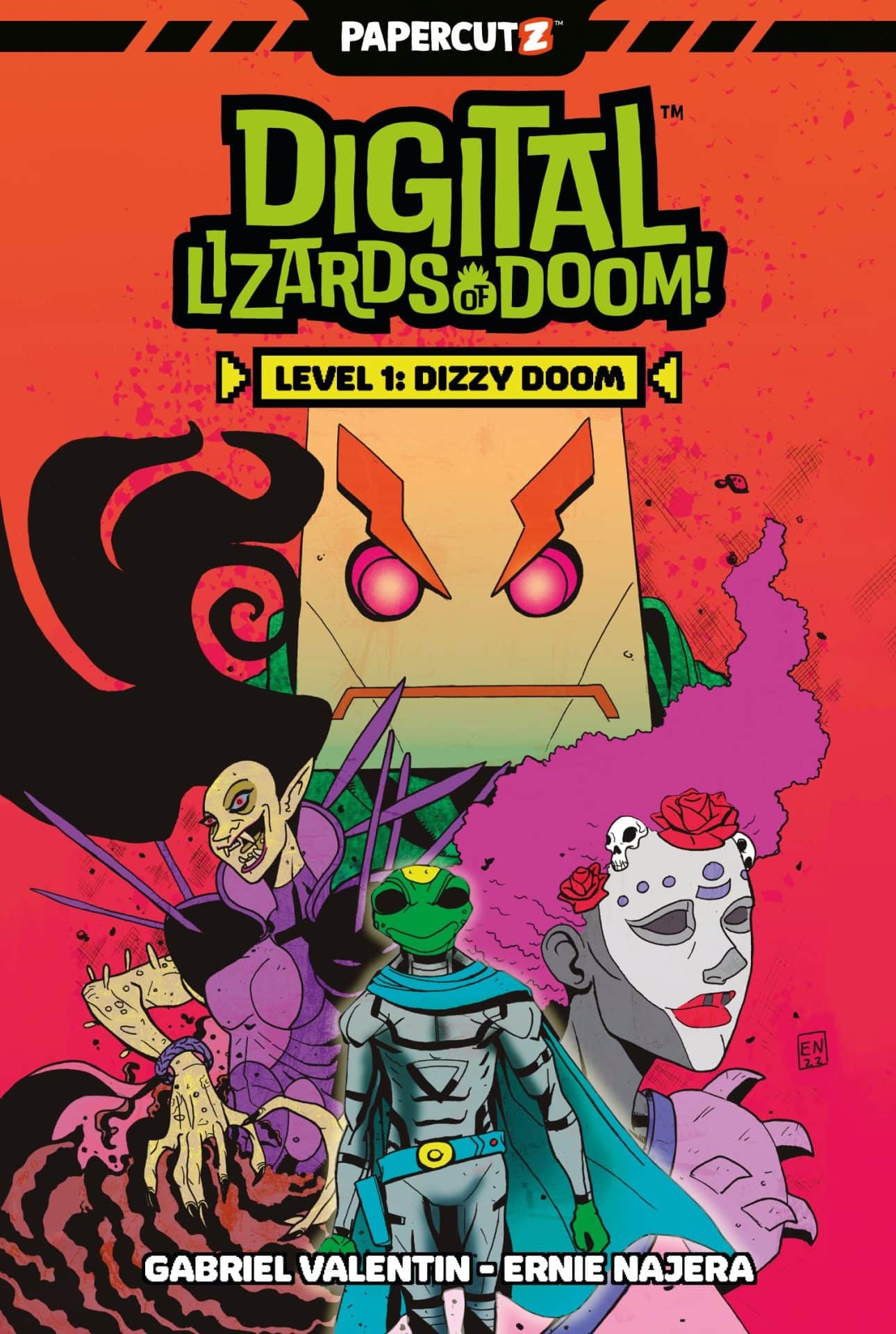 Digital Lizards of Doom is a landmark publication for Papercutz. Papercutz is known internationally for producing great graphic novels, so we’re more than thrilled to introduce a project that is part of such an impressive independently created mixed-media universe. Digital Lizards of Doom is the first in a series that will let readers grow alongside the story, while expanding their love of the DLOD universe through the incredible combination of music, literature, adventure, and pop culture. Creator Gabriel Valentin has paired his incredible first book with original DLOD music, which will be available on the DLOD website– and both are sprinkled with hidden easter eggs referencing the classic pop culture moments that influenced him. Will you be able to spot all of them?