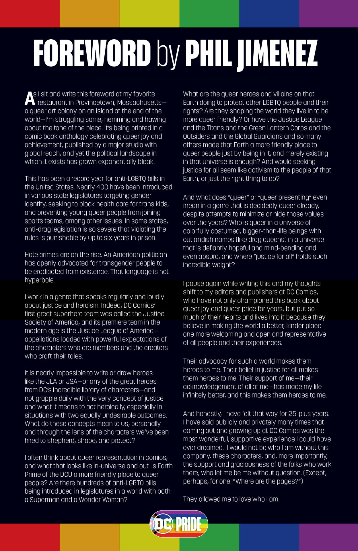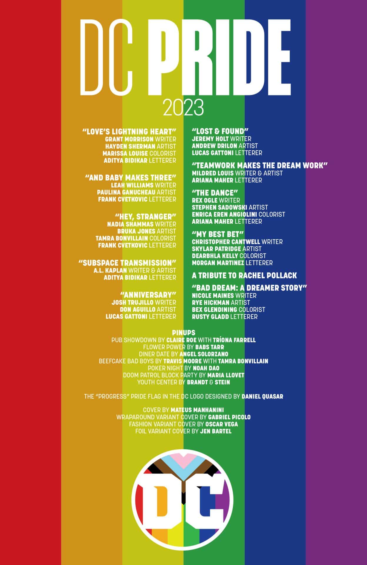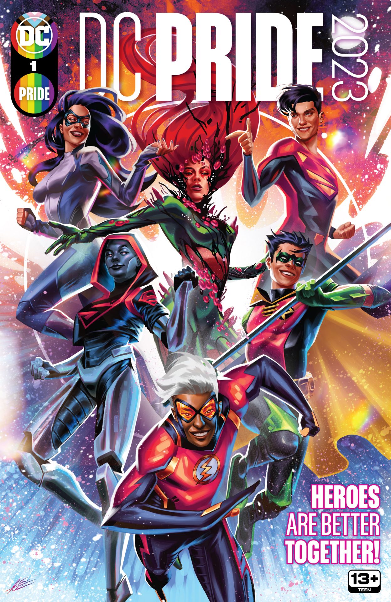 DC Pride is back again with a brave and bold and all-new collection of stories starring DC’s fan-favorite stable of LGBTQIA+ characters–many of whom will find themselves in thrilling team-ups the likes of which you’ve never seen before! Harley Quinn and Poison Ivy go to extreme measures to get a little alone time…but there’s nowhere on the planet Crush can’t crash! Jon Kent gets a comprehensive course in dark magic when John Constantine sics a golem on him. Tim Drake and Connor Hawke learn that there’s nothing more awkward than reuniting with an old friend after you’ve both come out and one of you was indoctrinated by the League of Shadows for a while. Circuit Breaker struggles to stifle his powers after the Flash of Earth-11 leaps out of the time stream and knocks them both into another dimension. Just how far would Flashlight go to honor his lost love? All these stories and many more in DC Pride 2023! This year’s anthology also includes: An introduction by Phil Jimenez! A 5-page preview of Dreamer’s YA debut written by Nicole Maines and drawn by Rye Hickman! A parade of pinups by Babs Tarr, Maria Llovet, Brandt & Stein, Noah Dao, Travis G. Moore, and more!
