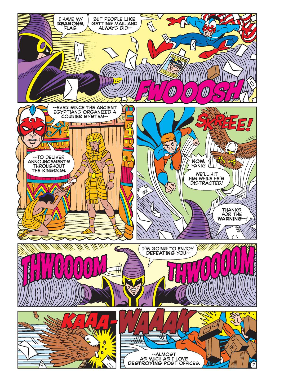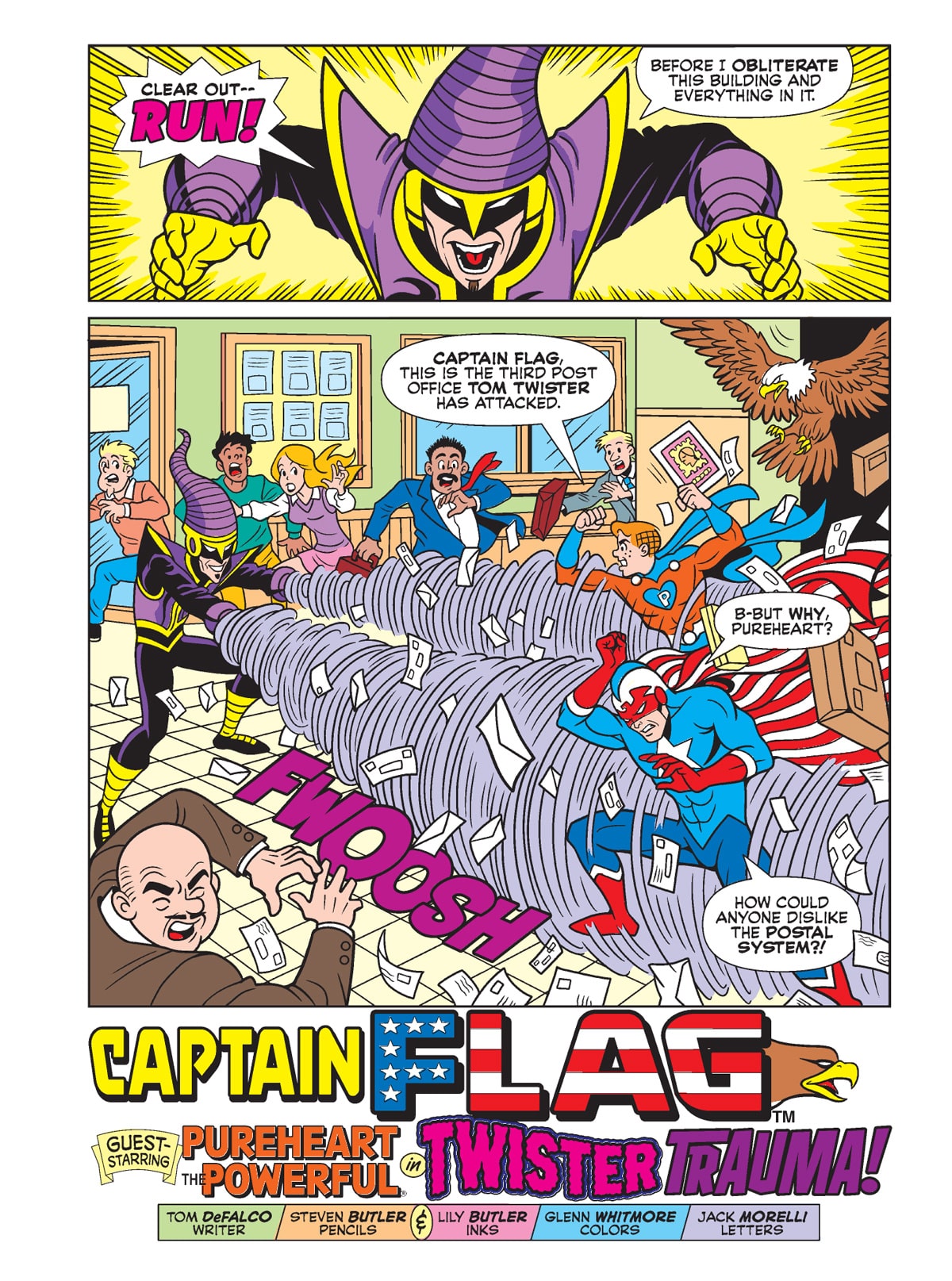 TWO BRAND NEW STORIES! First, in “Twister Trauma,” Captain Flag and Pureheart are battling Tom Twister—a super-villain with the ability to turn into a tornado-like creature! Tom Twister’s primary target: the post office! Can the two heroes stop him from whipping up a mail-storm?!