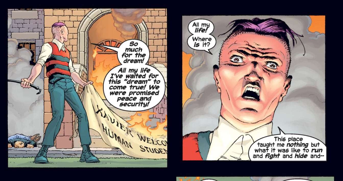 Quentin at the climax of the riot exclaims “So much for the dream! All my life I’ve waited for this “dream” to come true! We were promised peace and security! All my life! Where is it!” Here we see his true motivations laid bare, he feels disowned and abandoned after learning about his adoption. And now he thinks his teachers also have failed him. Quentin Quire has devastating abandonment issues that fuel his actions in Riot at Xavier’s.